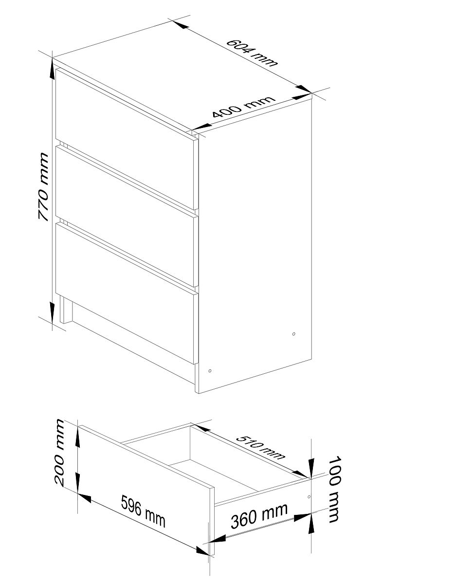 FEHÉR KOMÓD K60 3 FIÓK 16 mm vastag kopásálló laminált lapból készült.