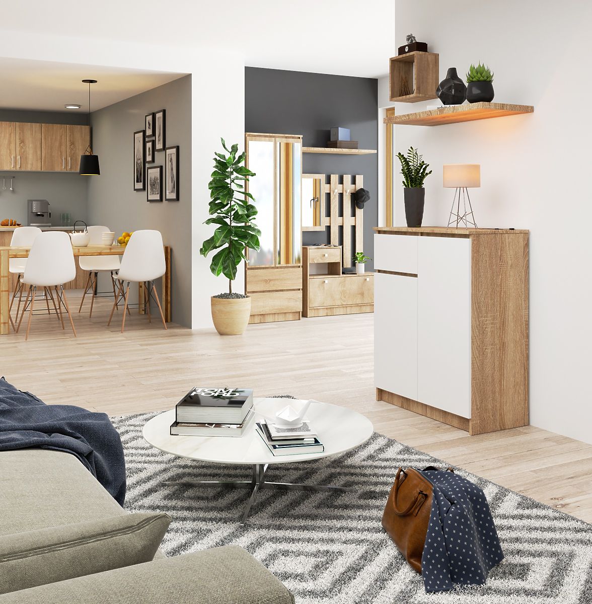 A kis komód egy olyan bútordarab, amely minden helyiségben helyet talál. A világos színek, a stabil szerkezet és a precíz kidolgozás egy olyan szekrényt eredményeztek, amely például az előszobába, a nappaliba vagy a gyerekszobába, de akár a hálószobába is illik. Irodában is használható, ahol számos dokumentum és egyéb irodaszerek tárolását teszi lehetővé. A komód két zárható szekrényből (mindegyikben két polc található) és egy fiókból áll. A bútor divatos színkombinációt - fehér és sonoma tölgy - ötvöz.