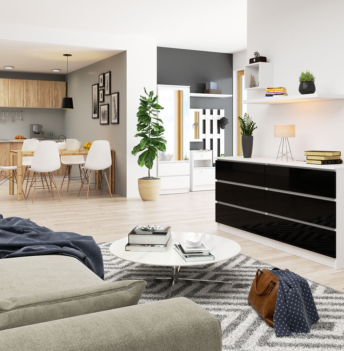 Fekete fényes komód 6 fiókkal, kopásálló laminált lemezből. .. többet