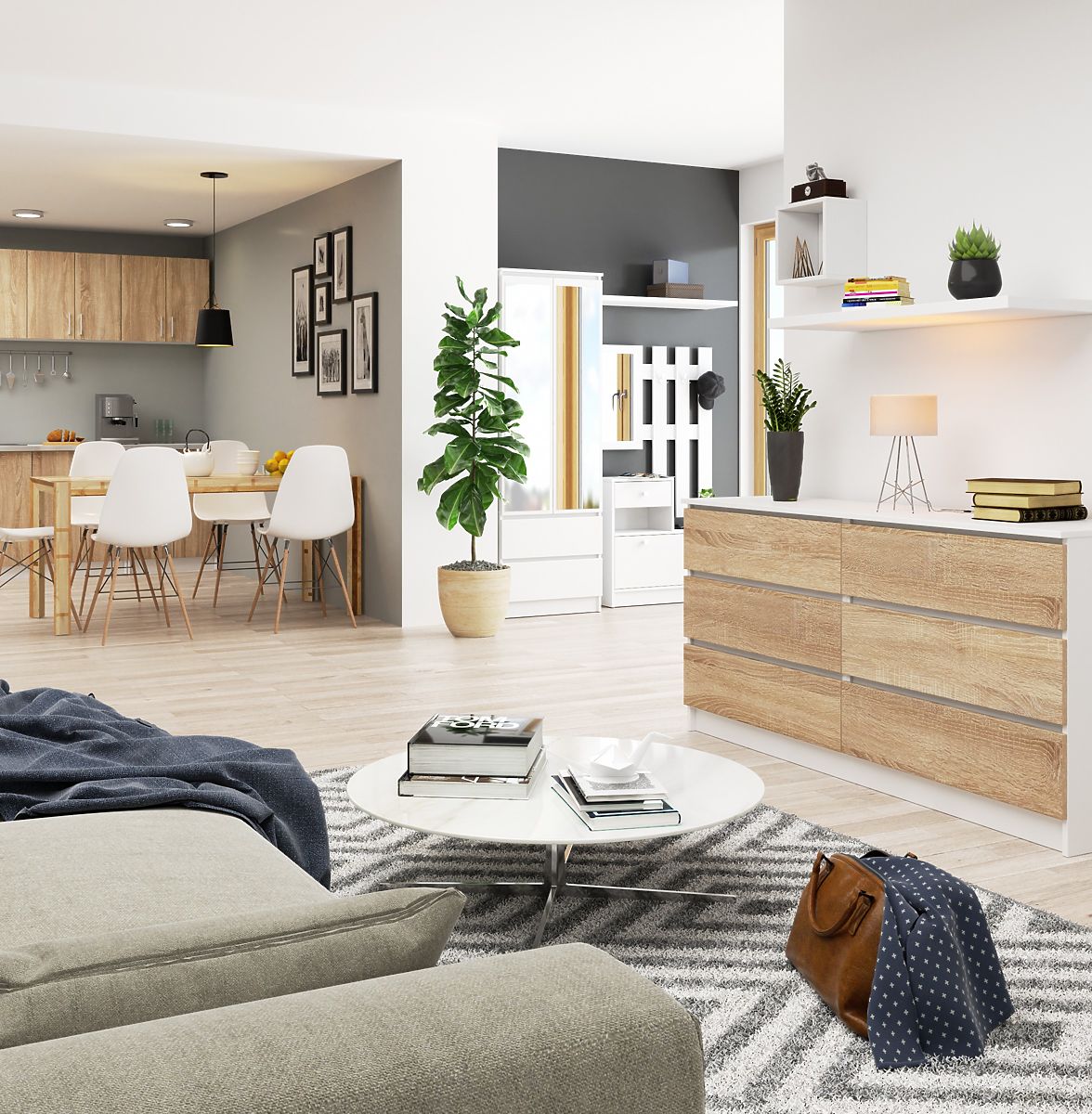 Az üzletünk kínálatában található komód rendkívül sokoldalú bútordarab. Illik ipari stílusú nappalikba, de a klasszikusabb berendezésűekbe is. Tökéletesen illeszkedik a rusztikus vagy skandináv enteriőrökbe is. Érdemes megemlíteni, hogy a komód hat fiókkal rendelkezik, amelyek kiváló minőségű fémgolyós csúszkákon mozognak. A bútort könnyen összeszerelheti saját maga. Ezen kívül a komód további jellemzői a következők: