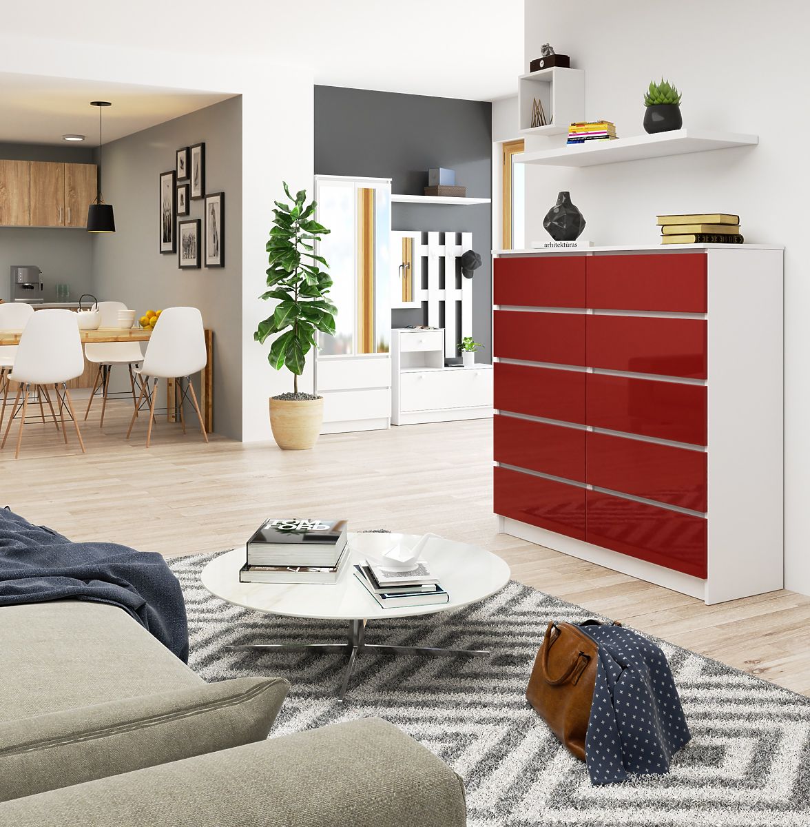 A fehér/piros fényes komód jól mutat fehér, tengerészkék, szürke és cappuccino háttérrel, de a merészebbek energikus narancssárgával, üvegzölddel vagy mély lilával is kombinálhatják. A bútor remekül illik a nappaliba, szabó- és kézműves műhelyekbe, modern irodákba, amelyek merész stílusban, bájjal vannak berendezve. Klasszikus elrendezésekbe is sikeresen beilleszthető.