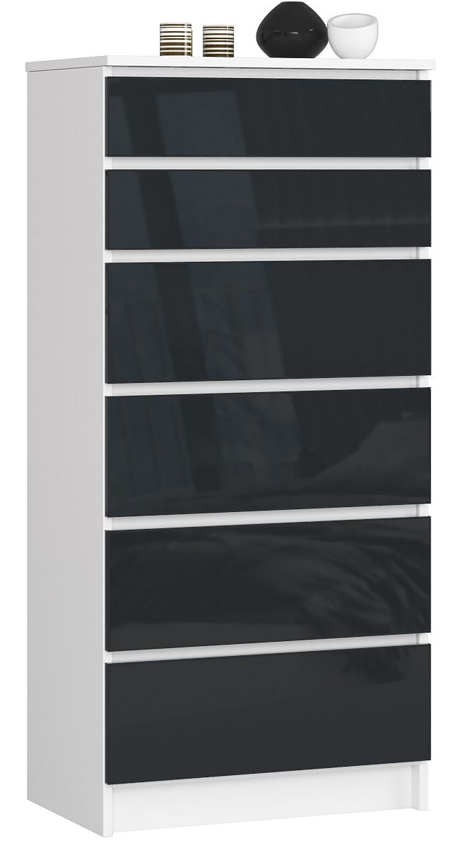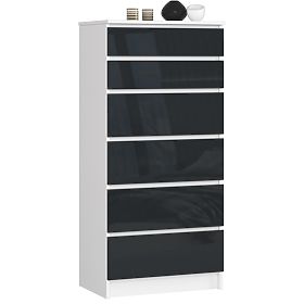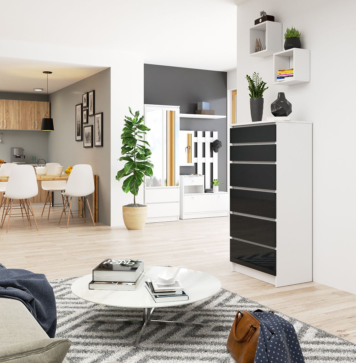 A K komódok funkcionális bútorok, amelyek alkalmasak nappalikba, hálószobákba, előszobákba, valamint otthoni vagy lakásbeli munkaterületekre. A fényes fehér korpusz és a hat grafitszürke fiók finoman illeszkedik a környezetbe. Multifunkcionális is — kényelmesen tárolhatók benne ruhák, fehérneműk vagy dokumentumok. Ezenkívül különféle dekorációk, például cserepes vagy vázás virágok, családi emlékek, fényképek is elhelyezhetők rajta.