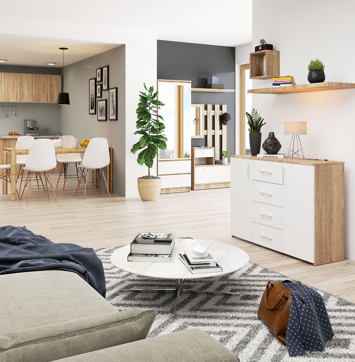 Tágas komód sonoma tölgy és fehér színben, sok tárolóhellyel. .. többet