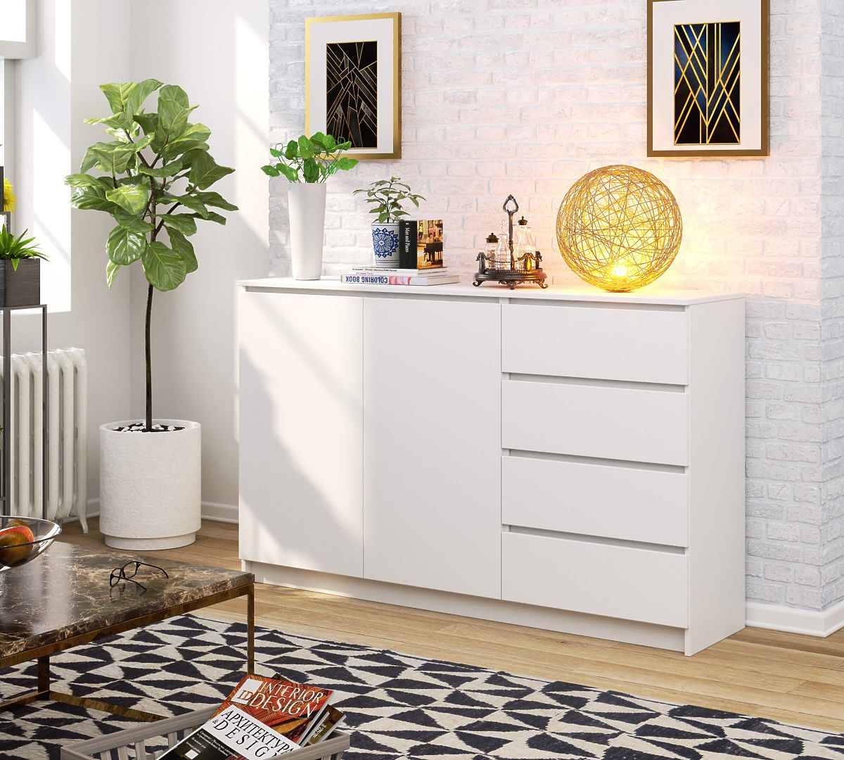 A fehér komód magas gyakorlati értékkel is bír. Négy könnyen nyitható fiókkal és két nagyon nagy polccal rendelkezik. Ez a kialakítás kényelmet biztosít a tárolás során, és nagyon funkcionális megoldást nyújt. A komódban minden szükséges dolgot tárolhat, és mindig egy helyen, kéznél tarthatja őket.