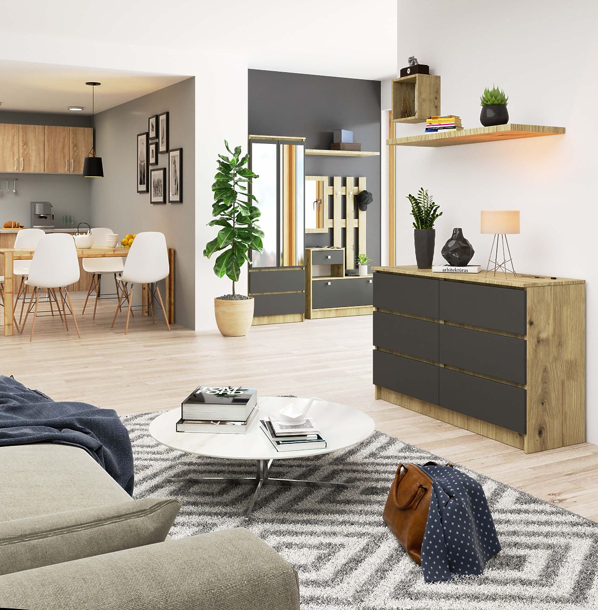 Kopásálló laminált komód 6 fiókkal, Artisan Tölgy és Szürke színben. .. többet
