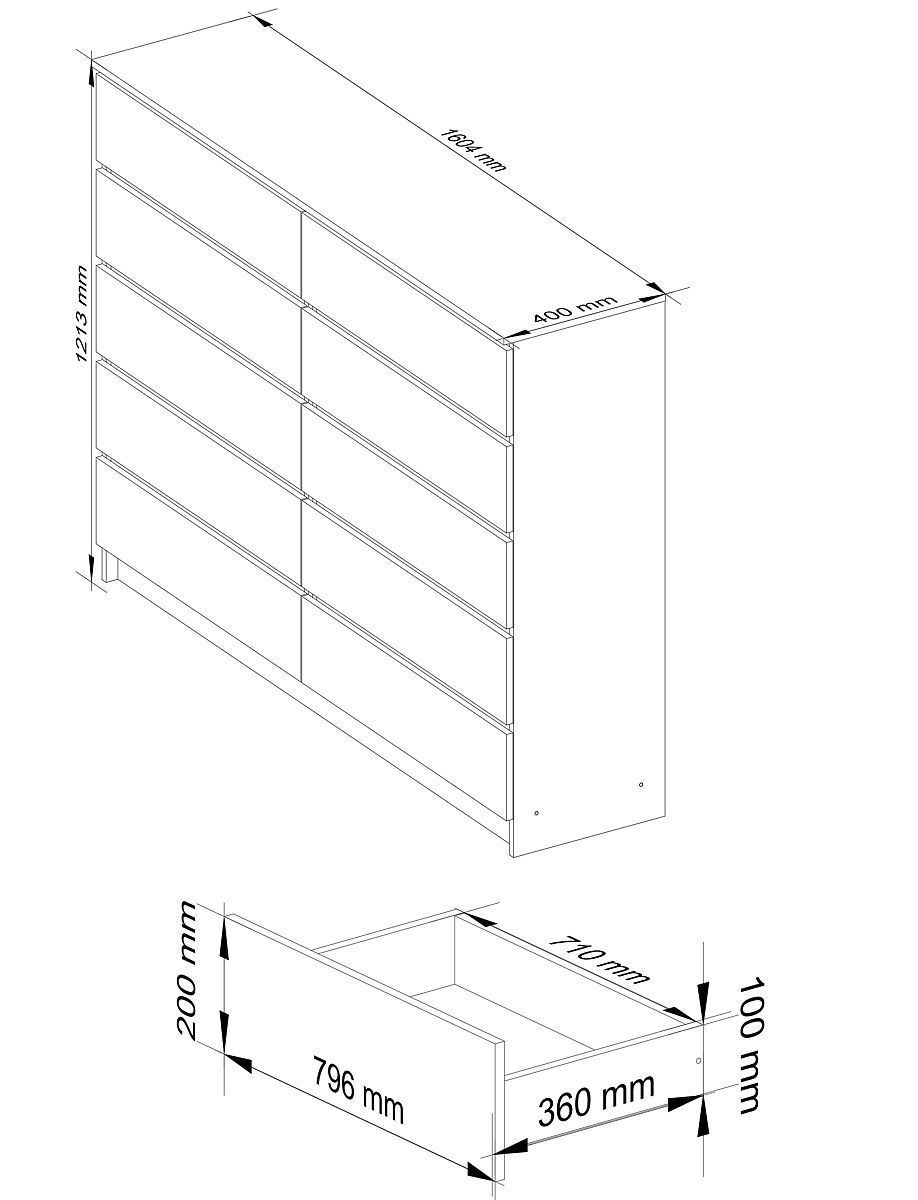 KOMÓD K 160cm 10 FIÓK Laminált lapból készült, 16mm vastag, kopásálló.