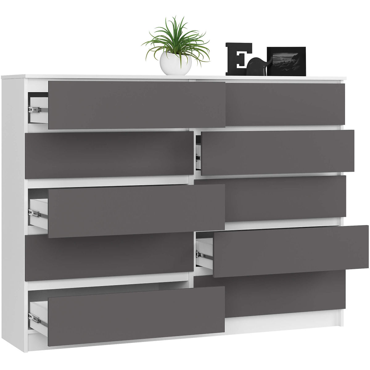 KOMÓD K 160cm 10 FIÓKOS Kiváló minőségű, 16 mm vastag, kopásálló laminált lapból készült.