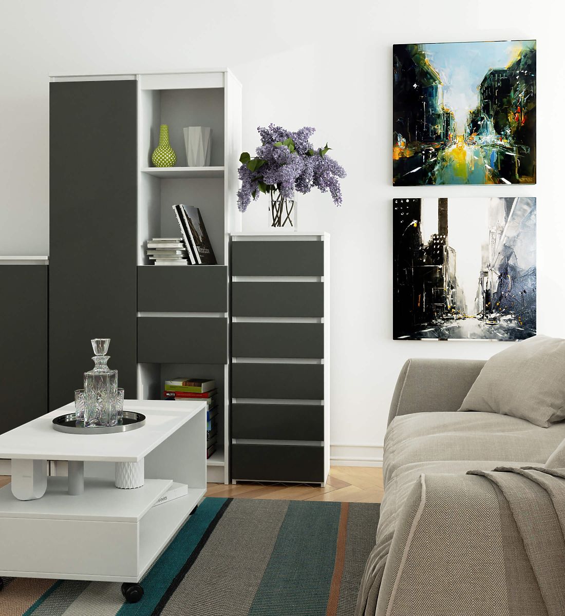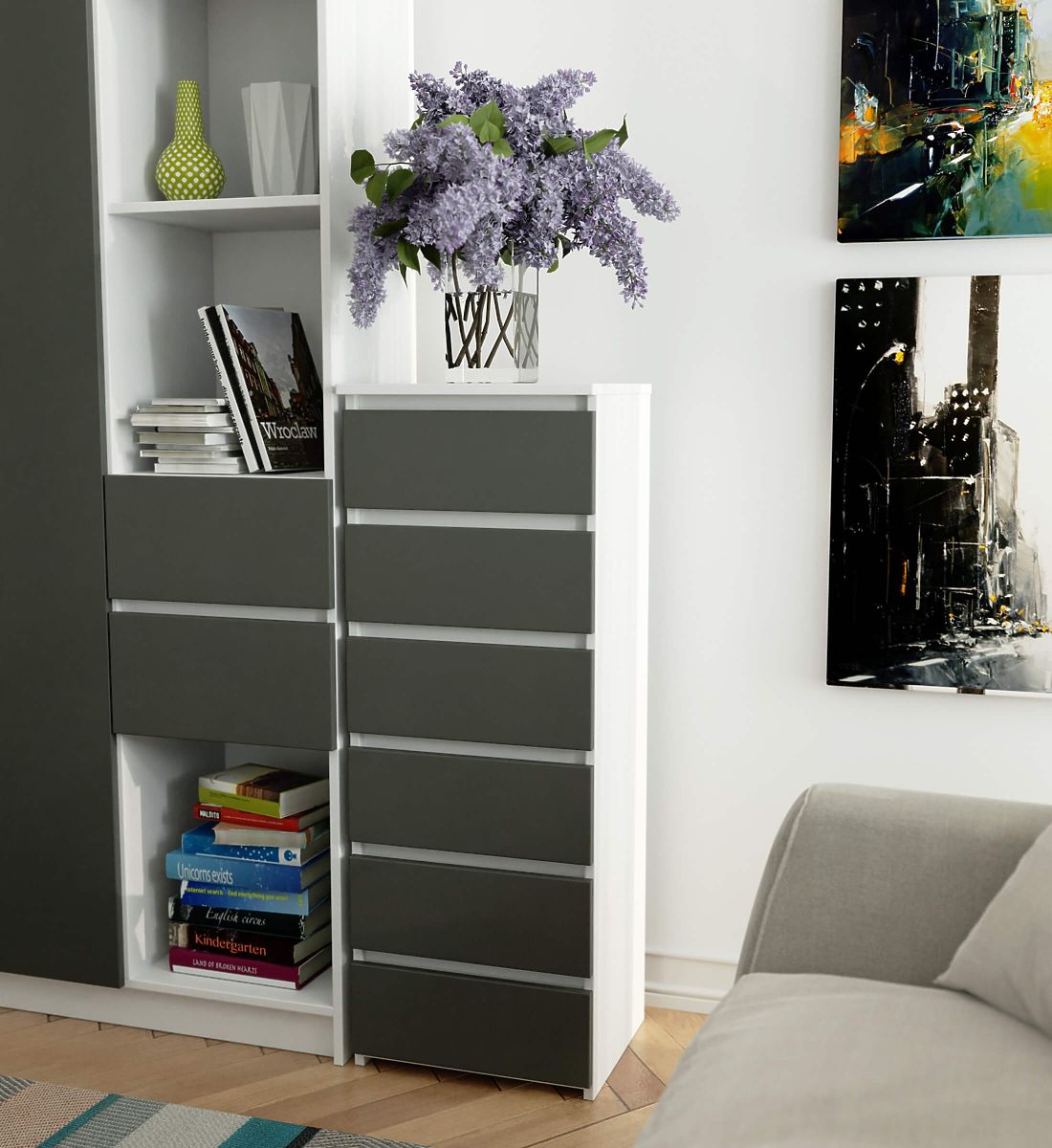 - elegáns megjelenés - a komód egyszerű formájú, stílusos fehér színnel és szürke előlappal rendelkezik,