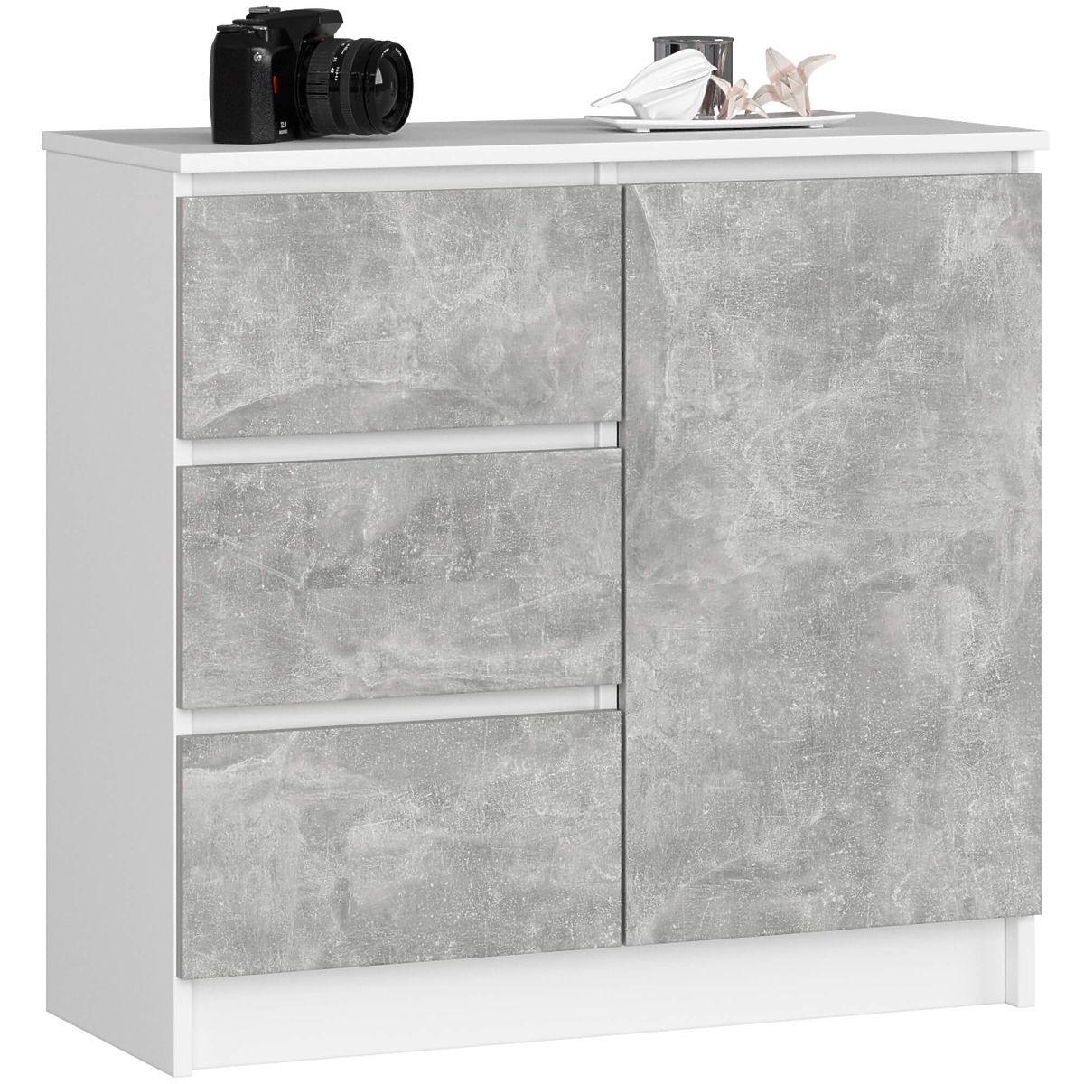 Kis komód fehér és beton színekben, 3 fiókkal és 1 ajtóval. .. többet