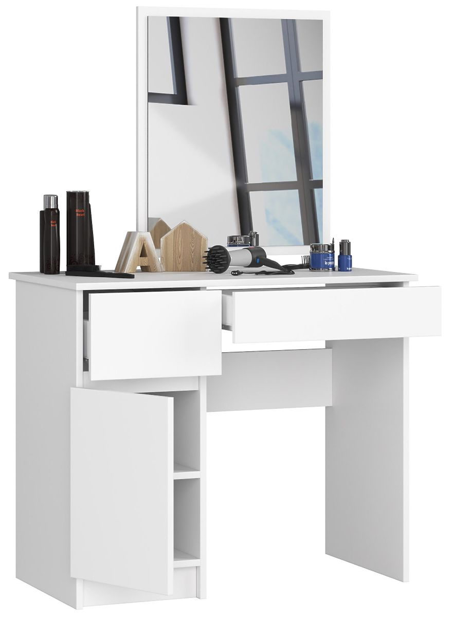 Fehér árnyalatú fésülködőasztal tükörrel, fiókokkal és tágas hellyel az ajtók mögött. Bal oldali konfiguráció.