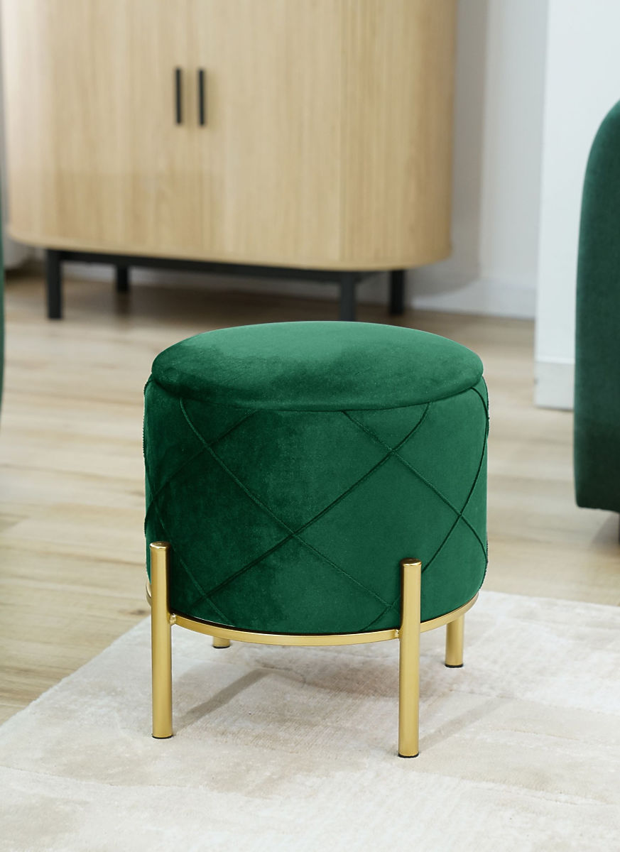 A lábtartó vagy puff nagyszerű kiegészítő a nappaliba vagy a hálószobába. Segítségével a fáradt lábak megpihenhetnek egy hosszú nap után, és ha a puff puha velúrból készült, az csak fokozza a pihenés kellemes érzését. A modern megjelenést kiegészítik az aranyszínűre festett fém lábak, amelyek idén annyira divatosak. A nyitható fedél hozzáférést biztosít a tárolóhelyhez, ahová a mindennapi használatra nem szükséges tárgyak elhelyezhetők.Specifikációk: