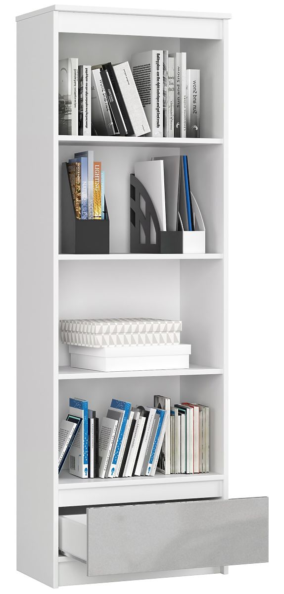 Az állvány egy olyan bútordarab, amely minden otthonban megtalálja a helyét. Használható könyvek, iratok és dossziék, fényképalbumok, valamint keretek, szuvenírek vagy sok más tárgy tárolására. Leggyakrabban ifjúsági szobában, nappaliban vagy otthoni irodában látható, de irodai helyiségekbe is kiválóan illik. Az állvány a jó ár, funkcionalitás, minőség és design kombinációja. Megérdemli az elismerést a két legdivatosabb és egyben időtlen szín - fehér és szürke - kombinációjának köszönhetően. Az állvány négy nagy polcból és egy tágas fiókból áll. A szekrény nagyon stabil, erős szerkezettel és részletekre való odafigyeléssel rendelkezik. Kopásálló, átlagon felüli tartósságú laminált lemezből készült. Az elülső részek szürke színben, fényes kivitelben készültek, ami egyedi karaktert kölcsönöz az egésznek. Meghívjuk Önt, hogy ismerje meg a kollekció további irodai bútorelemeit is.