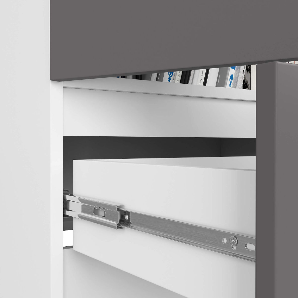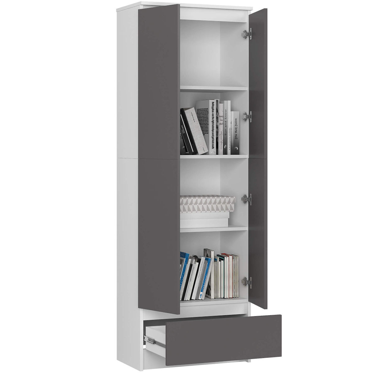 A CLP 1 irodai polc egy tágas, 180 cm magas és 60 cm széles szekrénnyel van felszerelve. A bútor lenyíló ajtókkal rendelkezik, amelyek mögött 4 tágas polc található. Ezek szabadon konfigurálhatók, mivel 3 szerelési lyuk van rajtuk. További előny a tágas fiók, amely modern, praktikus golyóscsúszkákon mozog. A fiók kihúzásgátlóval van ellátva. A bútor frontjai elegáns grafitszürke színűek, míg a korpusz fehér.