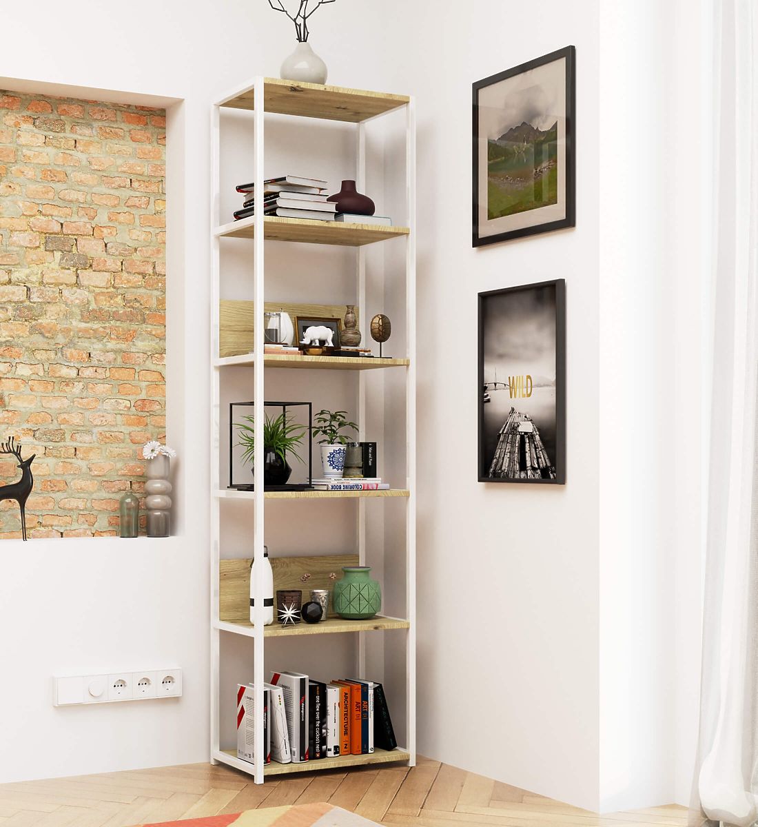 - elegáns megjelenés: a polc egyszerű formájú, a keret fehér, míg a polcok tölgy artisan színűek,