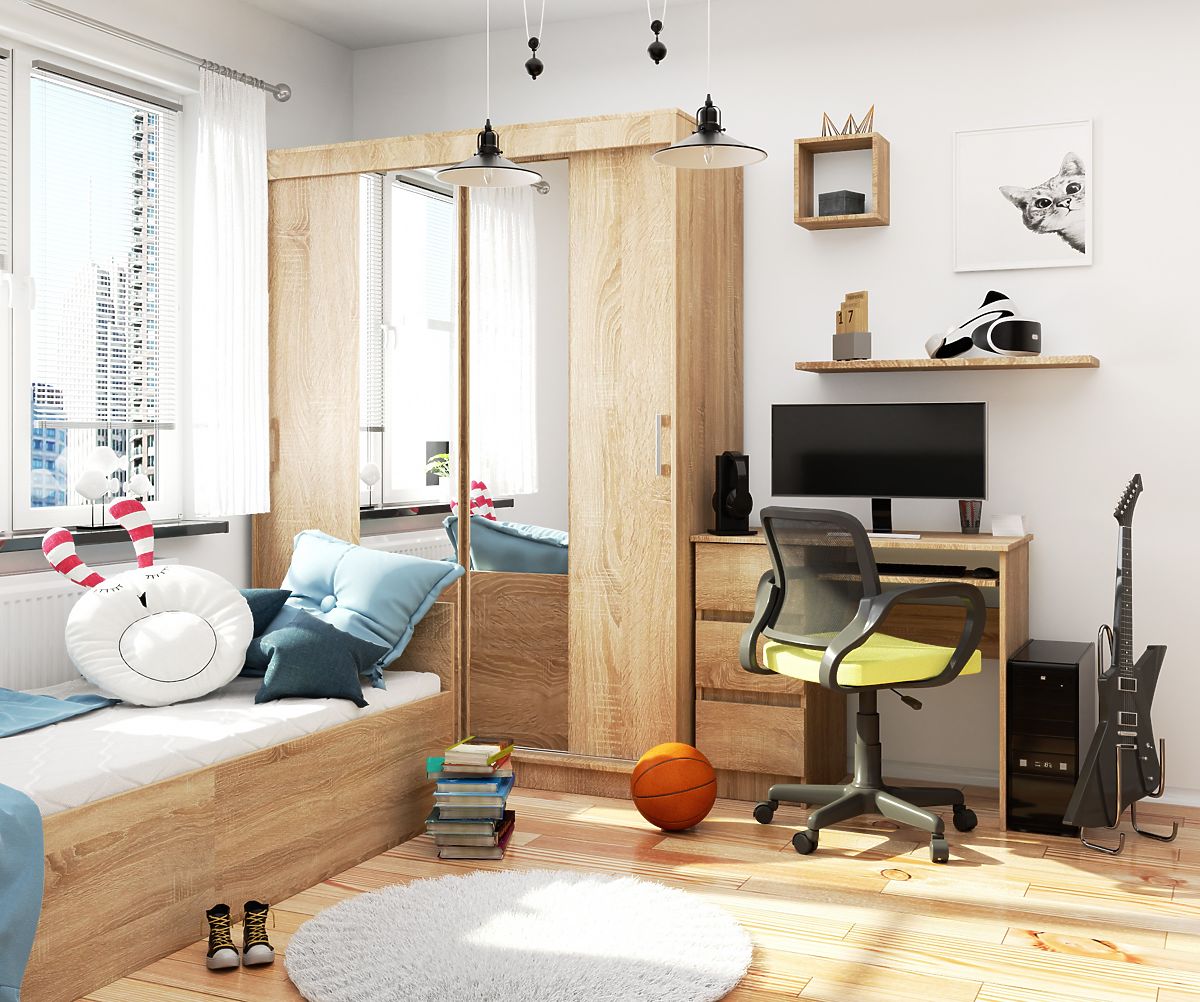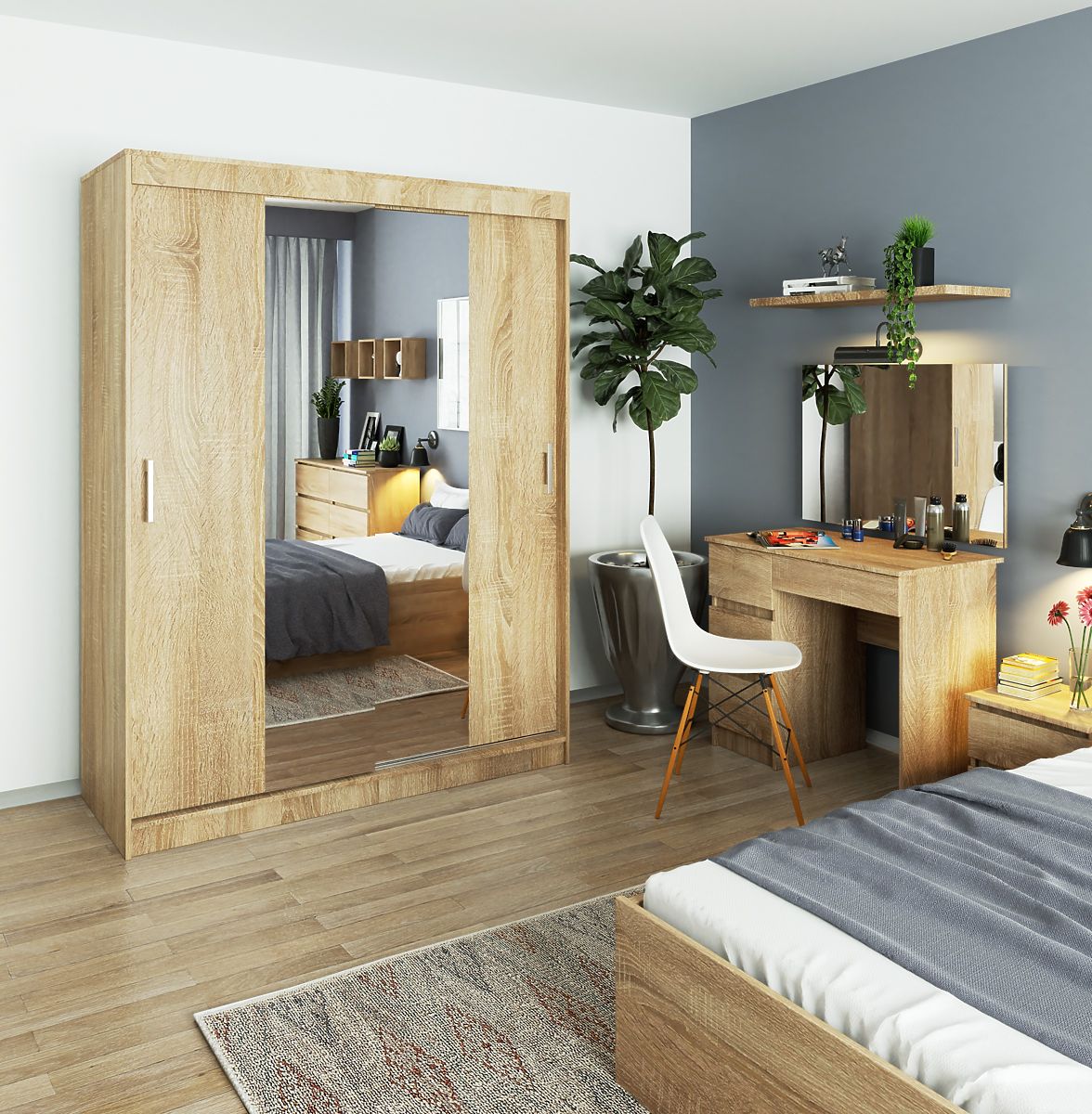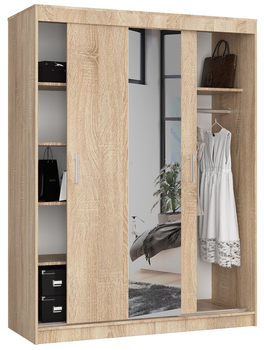Tágas, sonoma tölgy színű tolószekrény tükörrel, univerzális és időtálló bútor, amely szinte minden lakóhelyiségben megállja a helyét. Kiválóan alkalmas gyerek- és ifjúsági szobába, valamint hálószobába vagy gardróbba. Megfelelően nagy előszobában szolgálhat felsőruházat és egyéb, otthon szükséges dolgok tárolására.