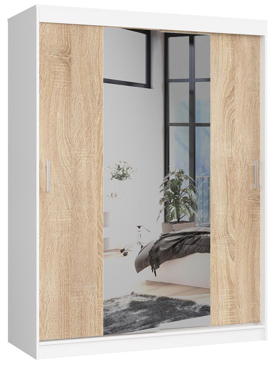 Fehér tolószekrény sonoma tölgy dekorral, 150 cm hosszú, polcokkal és ruharúddal. Nagy felület kihasználásra.