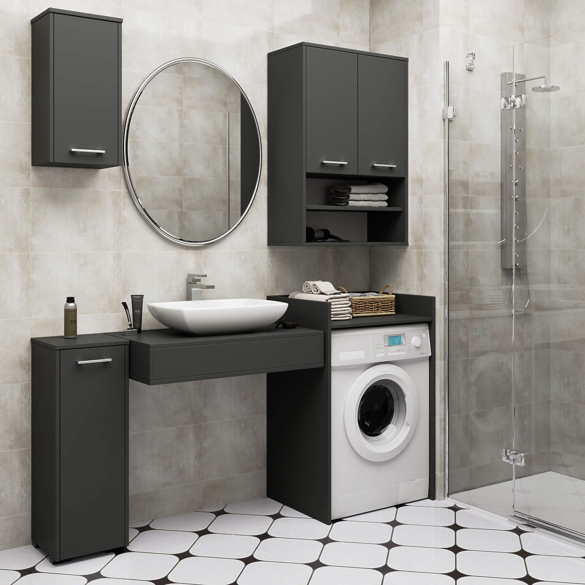 Ha azt szeretnénk, hogy a fürdőszobánk kényelmes és stílusos legyen, érdemes masszív és funkcionális bútorokat választani. Ilyen például a mosógép feletti szekrény. Ez egy ideális módja annak, hogy kihasználjuk a mosógép feletti teret, amely általában kihasználatlan marad. Ennek az oszlopnak az optimális méretei azt is jelentik, hogy kiváló megoldás a kis alapterületű fürdőszobák számára. Ergonomikus formája lehetővé teszi, hogy bármely helyiségben használható legyen. A gyönyörű grafit szürke árnyalat elegáns megjelenést biztosít a fürdőszobának. A szekrény anyaga, a laminált lap, kiváló minőségű, amely biztosítja a bútor tartósságát és szilárdságát, valamint esztétikai megjelenésének megőrzését.