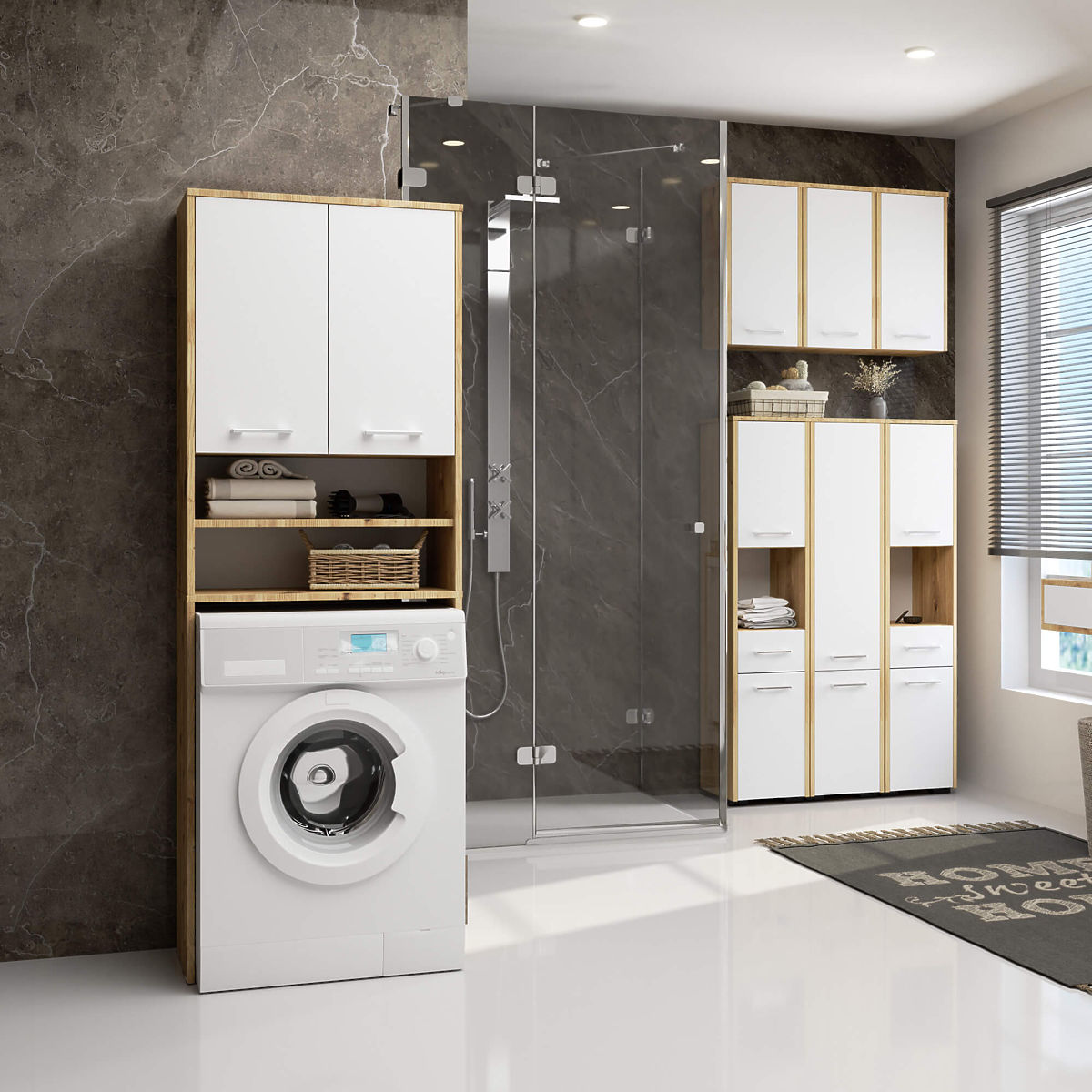 A mosógép fölé helyezhető fürdőszobai szekrény praktikus és vonzó dizájnú bútor. A polc alsó részén, közvetlenül a mosógép számára kialakított fülke felett két tágas polc található, a felső részén pedig egy tágas tárolóhely, amely dupla ajtóval zárható. A szekrény univerzálisan használható, és segít a fürdőszobai tér tökéletes kihasználásában és a rend fenntartásában. A bútor használható törölközők, tisztítószerek vagy mosóporok és öblítők tárolására. A mosógép fölé helyezhető fürdőszobai oszlop nedvesség- és kopásálló laminált lapból készült. A bútor éleinek gondos kidolgozásához a gyártó tartós ABS élt használt. A bútor ajtajai kényelmes és esztétikus fém fogantyúkkal vannak felszerelve. A fürdőszobai polc, amely két színt - klasszikus fehér és artisan tölgy - kombinál, könnyen illeszkedik bármilyen típusú fürdőszobai belső térhez. A fürdőszobai szekrény könnyed megjelenésű, ezért hatékonyan mutat még a nem szabványosan kis alapterületű fürdőszobákban is.