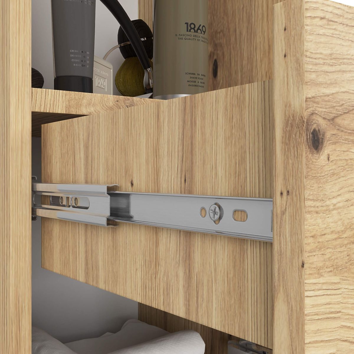 Mi jellemzi a FIN 2D fürdőszobai oszlopunkat? Elsősorban a szokatlan, modern dizájn. Tökéletesen illeszkedik a mai fürdőszobák modern megjelenéséhez, és a szokásos szekrényekkel ellentétben nem fehér színű. Ez egy kis melegséget ad a rendszerint hideg helyiségnek. A karcolás- és kopásálló, valamint a nedvességnek ellenálló lapból készült oszlop az egyik legjobb befektetés. A 140 cm-es magasság lehetővé teszi a szükséges dolgok tárolását, és további helyet biztosít azok elhelyezésére, amelyeket gyakran használunk. Az oszlop 30 cm-es mélysége és hossza nem foglal sok helyet, és különösen alkalmas kis terekbe, míg a két függetlenül zárható polc nagy mennyiségű tárgyat, például törölközőket is elfér. Egy további fiók lehetővé teszi a kisebb tárgyak elrejtését. Az artisan tölgy színű fürdőszobai oszlop elegáns lábakon áll, amelyek biztosítják a stabilitását.