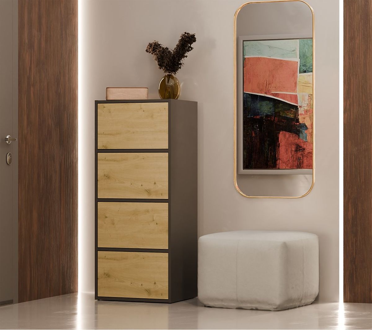 Az ALMA komód a funkcionalitás és a modern esztétika kombinációja. Kiválóan illik minden helyiségbe, praktikus tárolóhelyet kínál és finom eleganciát kölcsönöz a belső térnek.