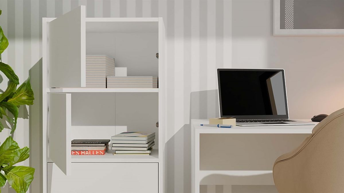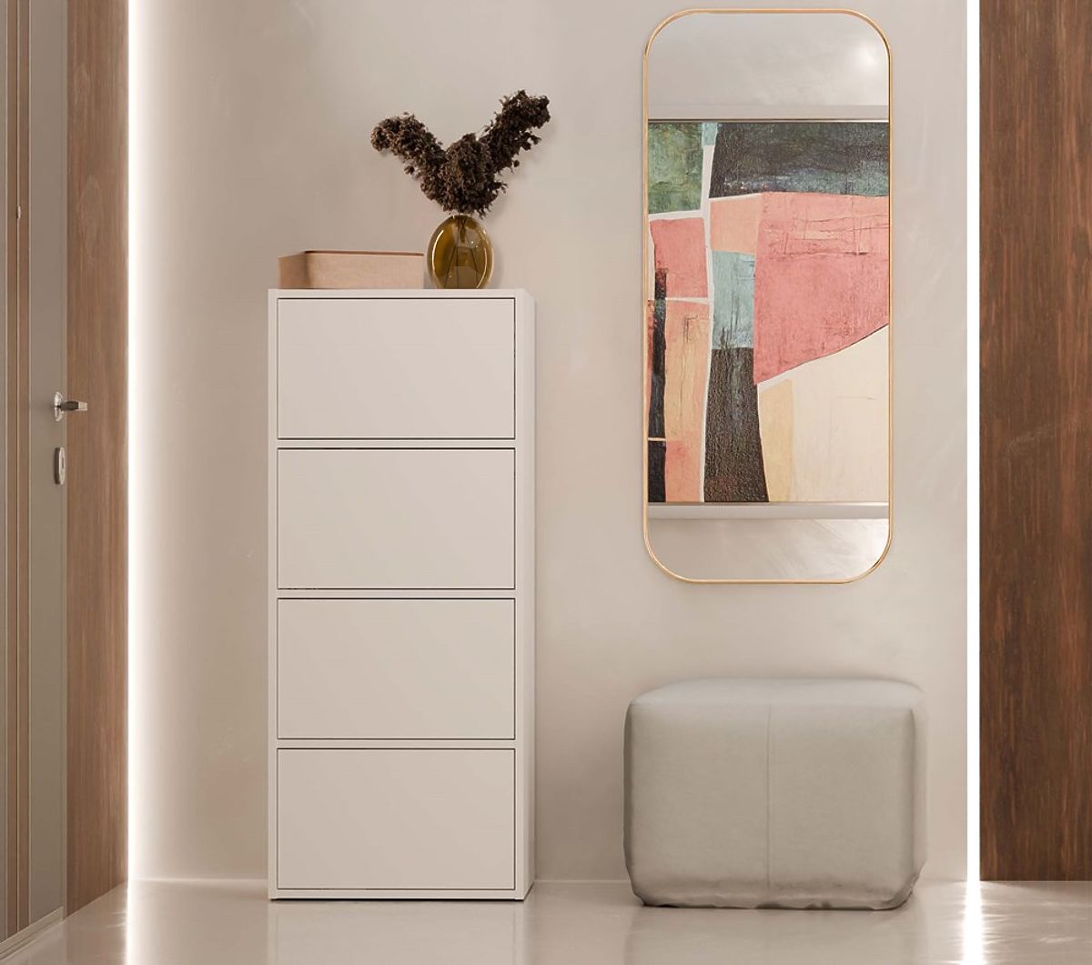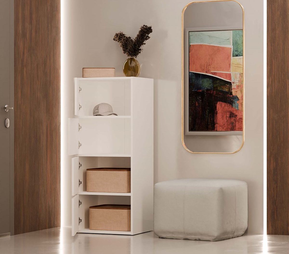 A sima ajtók mögött rejtett tágas polcok rengeteg tárolóhelyet biztosítanak, megkönnyítve a rend fenntartását bármely térben.