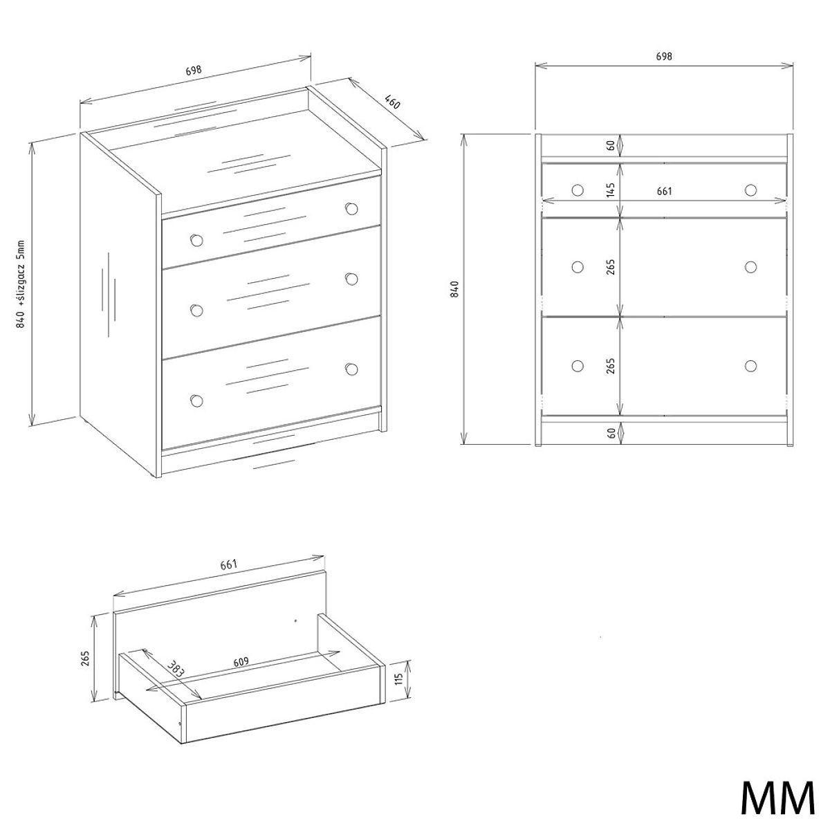 A 3 tágas fiók kényelmes fogantyúkkal elegendő helyet biztosít ruhák, kiegészítők, textilek vagy gyermekholmik tárolására.