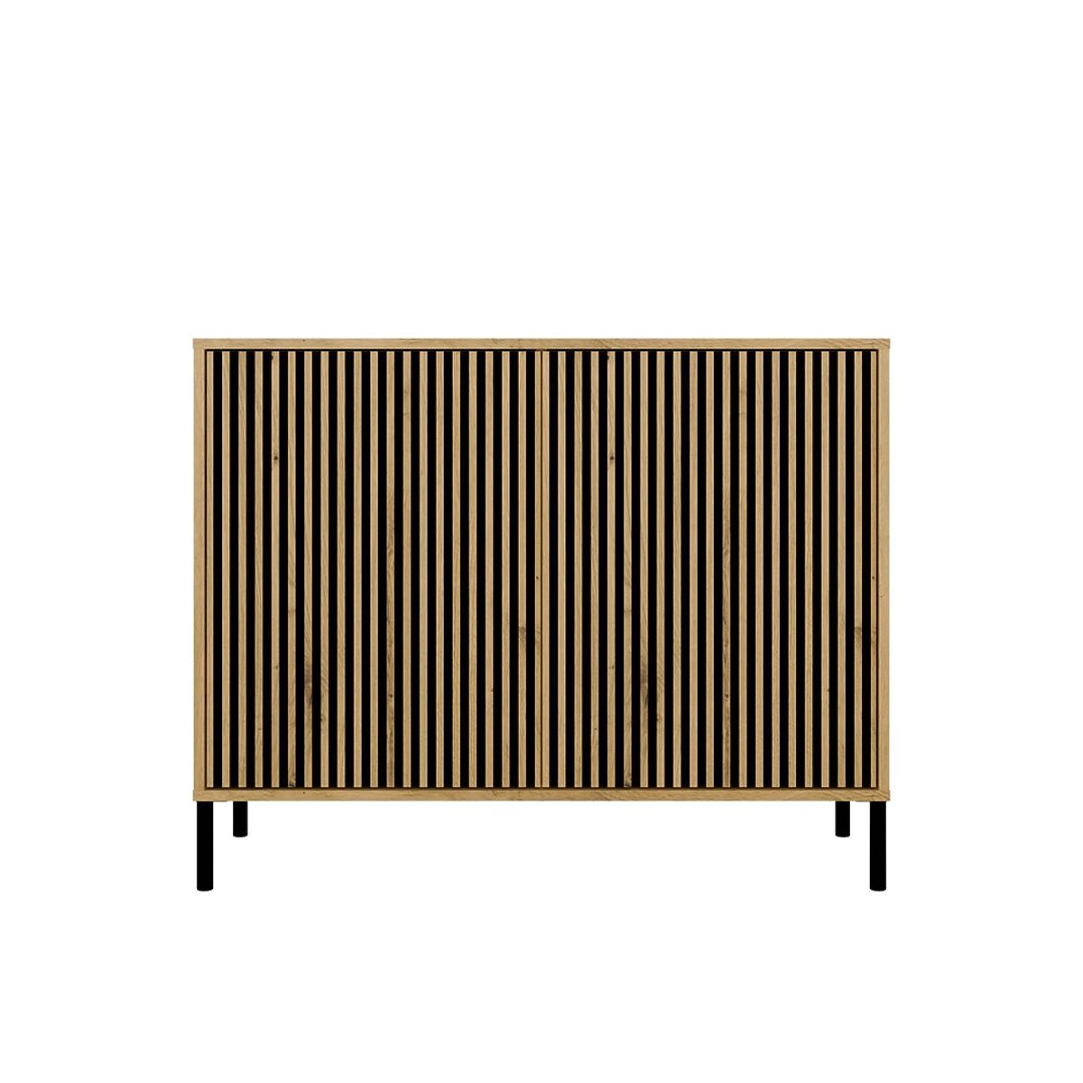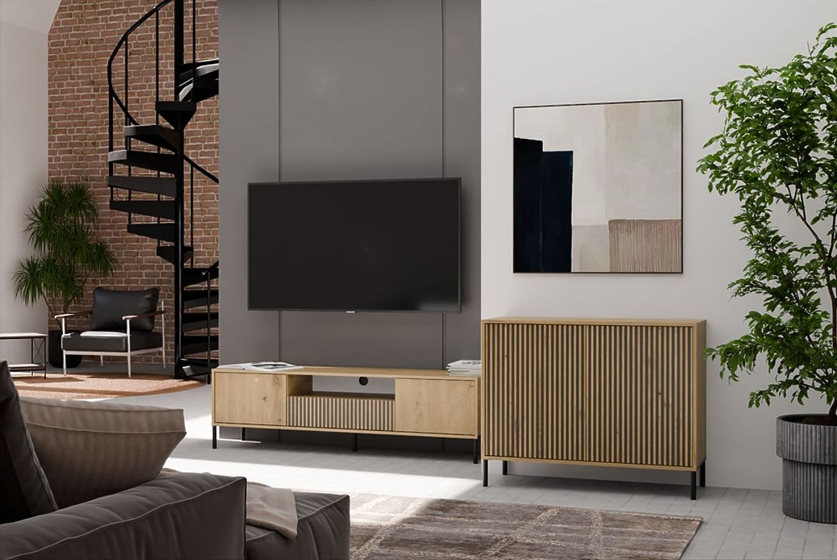 SZÍN: ARTISAN TÖLGYELEGANCIA ÉS PRAKTIKUM EGYBENA KAMARO 2D SLIM komód az esztétika és funkcionalitás kombinációja, amely tökéletesen illik a nappaliba, vendégszobába, hálószobába vagy dolgozószobába. A bordázott ajtó előlap (amely lamellákat idéz) modern és eredeti megjelenést kölcsönöz a bútornak, amely tökéletesen illeszkedik a kortárs enteriőrökbe.