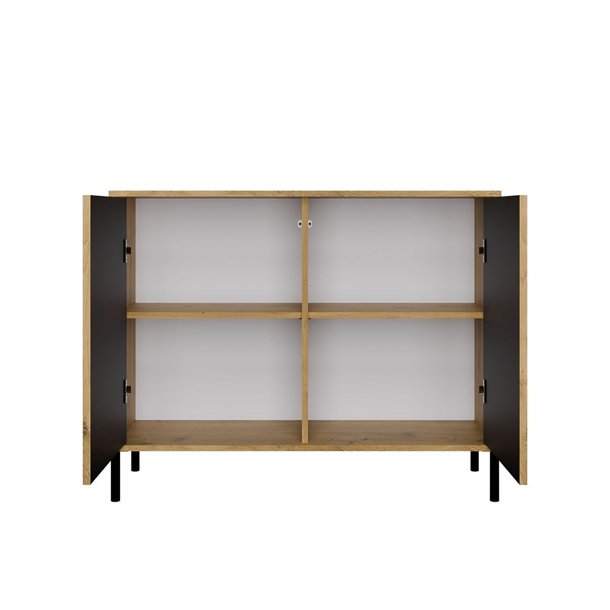 A modern TIP-ON rendszer lehetővé teszi a kényelmes fogantyú nélküli használatot — csak finoman meg kell nyomni az ajtót, hogy a szekrény kinyíljon. A komód nagy tárolóhelyet kínál, miközben megőrzi minimalista és elegáns karakterét, amely sokféle elrendezéshez illik.
