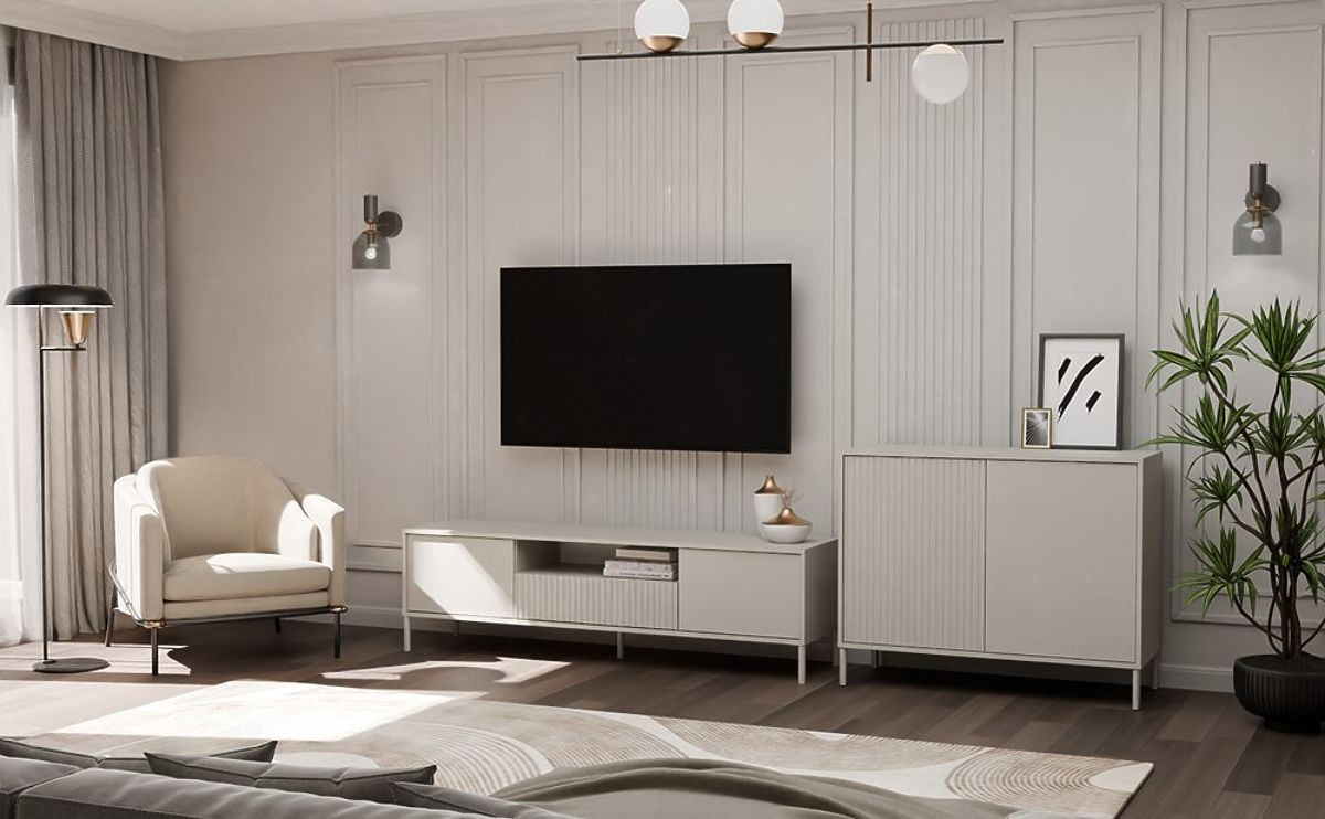 A modern TIP-ON rendszer lehetővé teszi a fogantyú nélküli kényelmes használatot — elég finoman megnyomni az ajtót, hogy a szekrény kinyíljon. A komód nagy tárolóhelyet kínál, miközben megőrzi minimalista és elegáns jellegét, amely sokféle elrendezéshez illik.