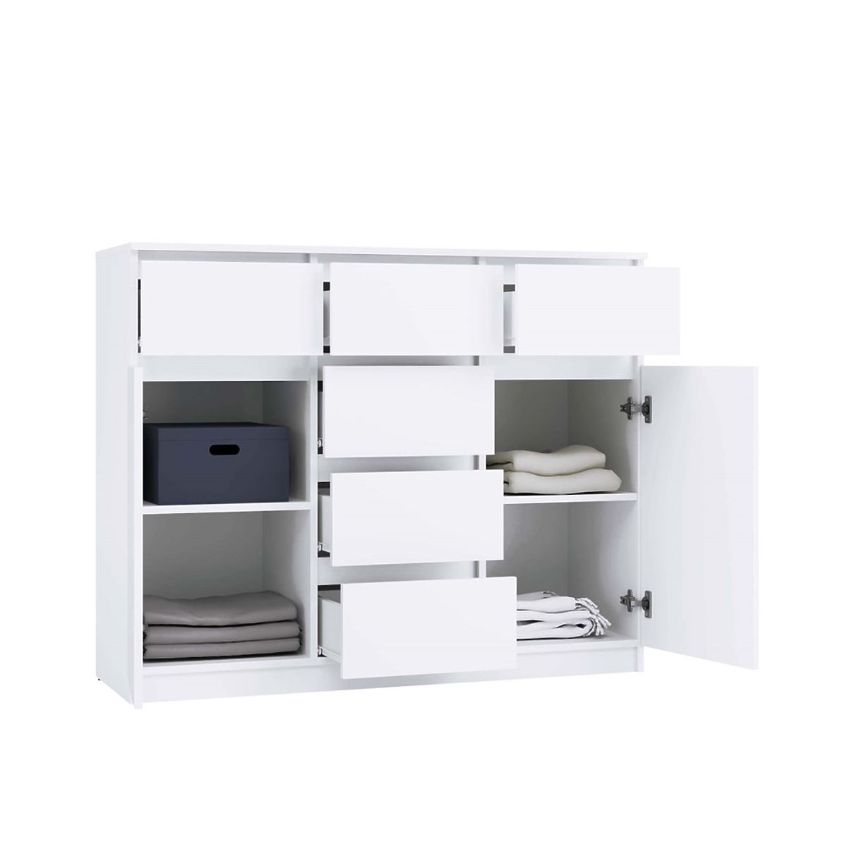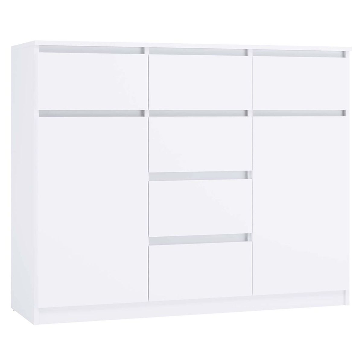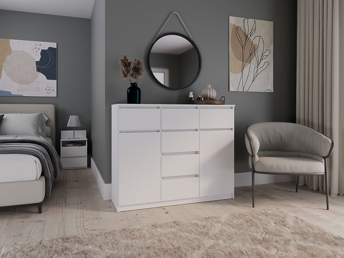 • Univerzális dizájn: Az egyszerű, elegáns forma matt fehér színben biztosítja, hogy a komód illeszkedjen mind a modern, mind a klasszikus belső terekhez. Fogantyú nélküli előlapok hangsúlyozzák a minimalista jelleget, miközben kényelmes használatot biztosítanak.