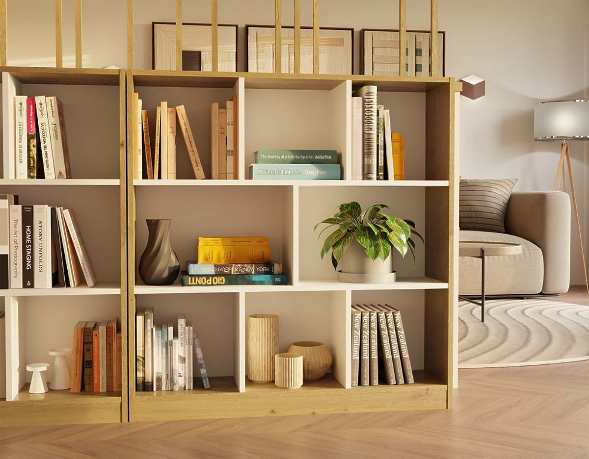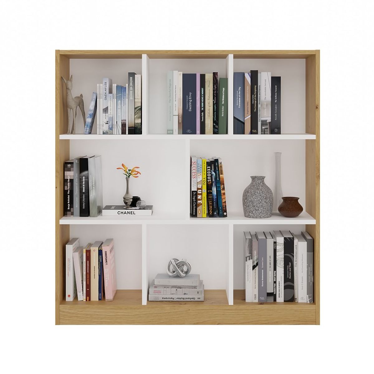 8 tágas rekesszel rendelkezik, amelyek segítenek a tér szervezésében és lehetővé teszik kedvenc tárgyaink esztétikus bemutatását. Az artisan tölgy meleg árnyalatának és a kontrasztos fehér polcoknak a kombinációja modern és elegáns karaktert kölcsönöz a bútornak.