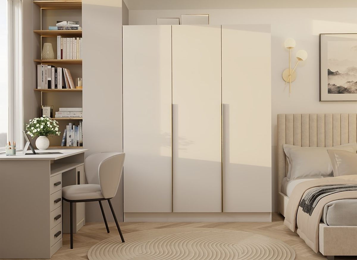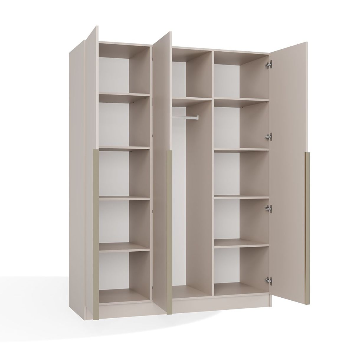 Ha a minimalizmus, az elegancia és a kivételes funkcionalitás kombinációját keresi, a SENSO 3D szekrény éppen Önnek való. Ez a háromajtós szekrény egyszerű formájával, kasmír színű matt felületével és jellegzetes, kefe arany árnyalatú arany fogantyúival tűnik ki, amelyek kiemelik luxus jellegét.