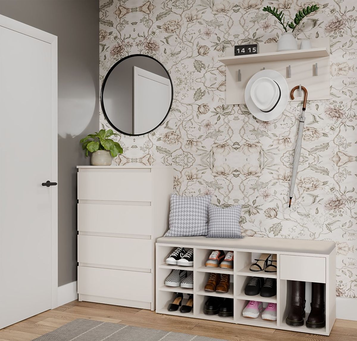 Nyitott cipősszekrény ülőhellyel és tárolóval. .. többet