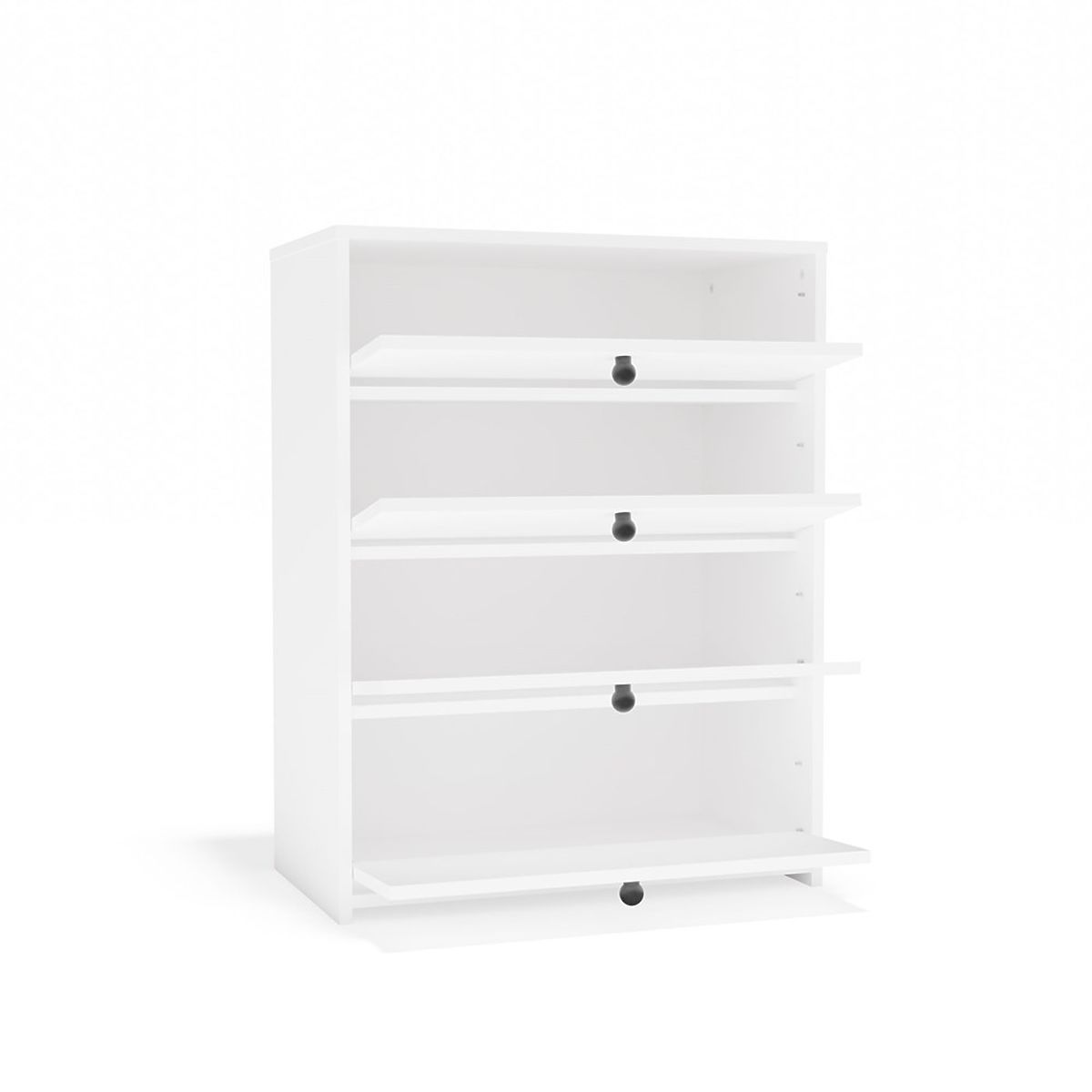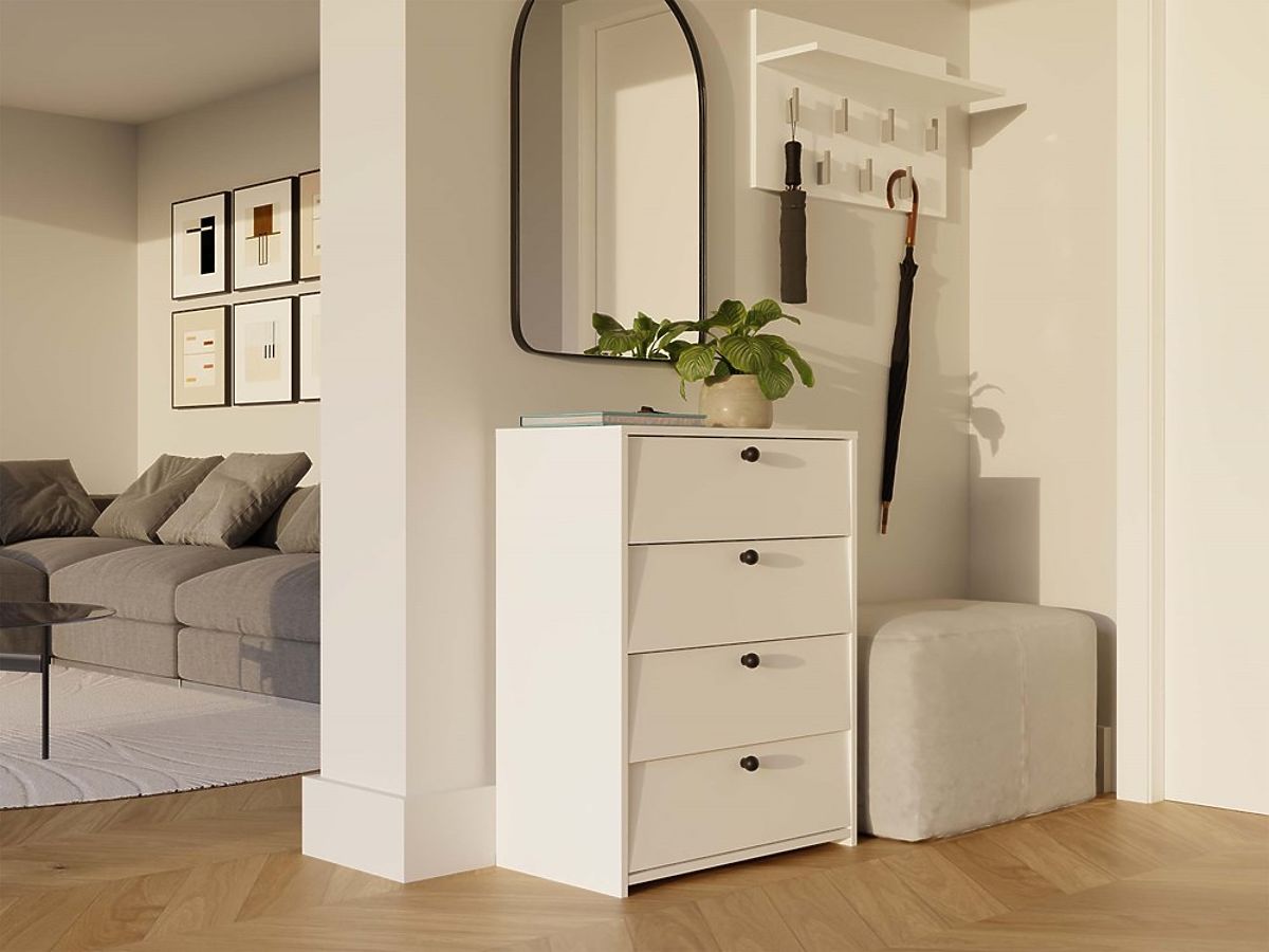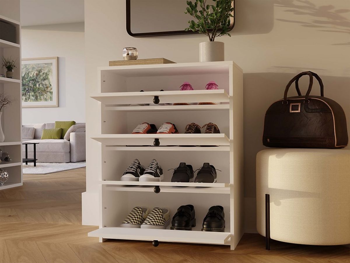 A minimalista forma és az univerzális fehér szín biztosítja, hogy a cipősszekrény könnyen illeszkedjen különböző elrendezésekbe - a klasszikustól a modernig. Lehet önálló elem vagy része egy nagyobb előszobai bútorkészletnek.