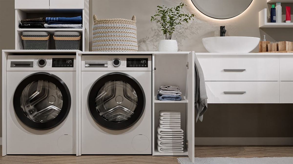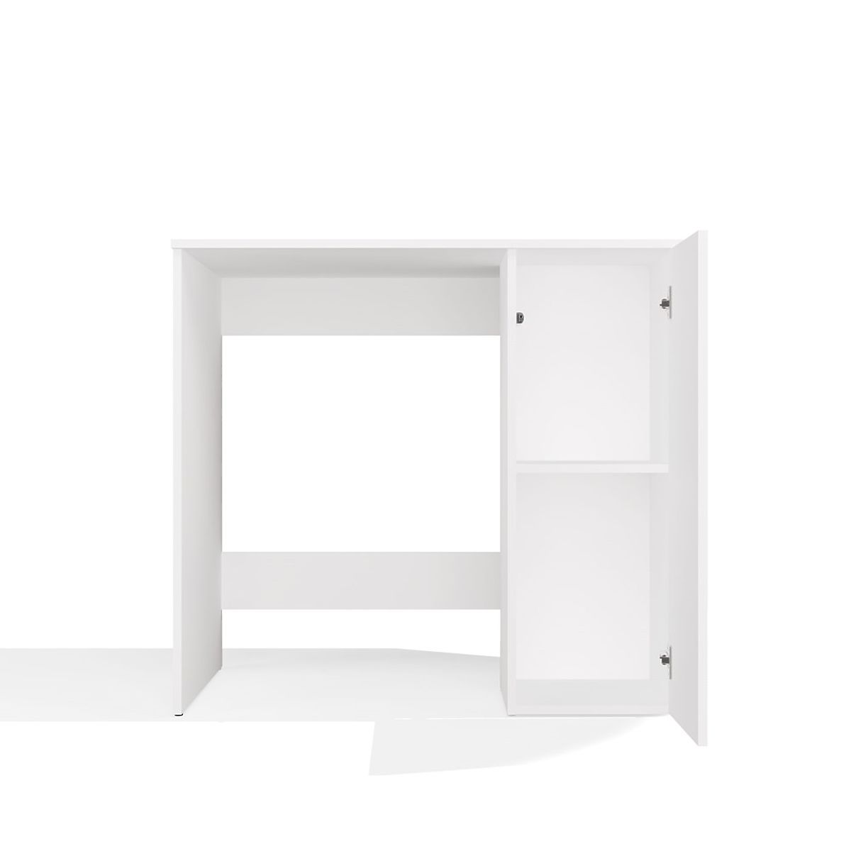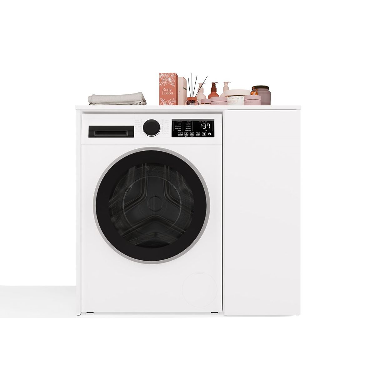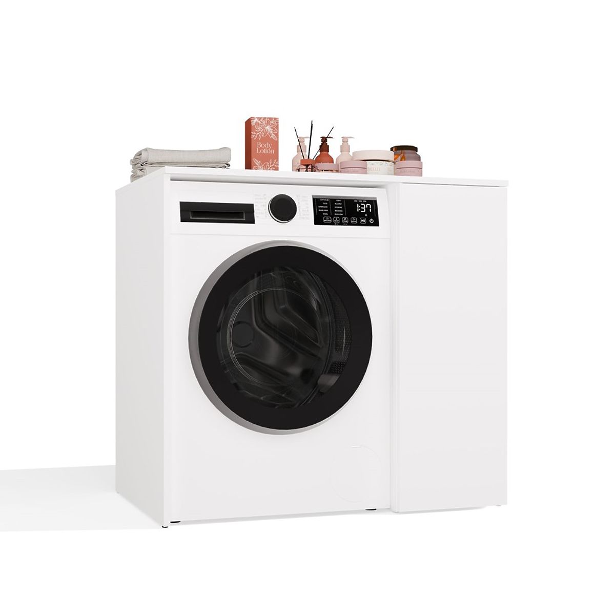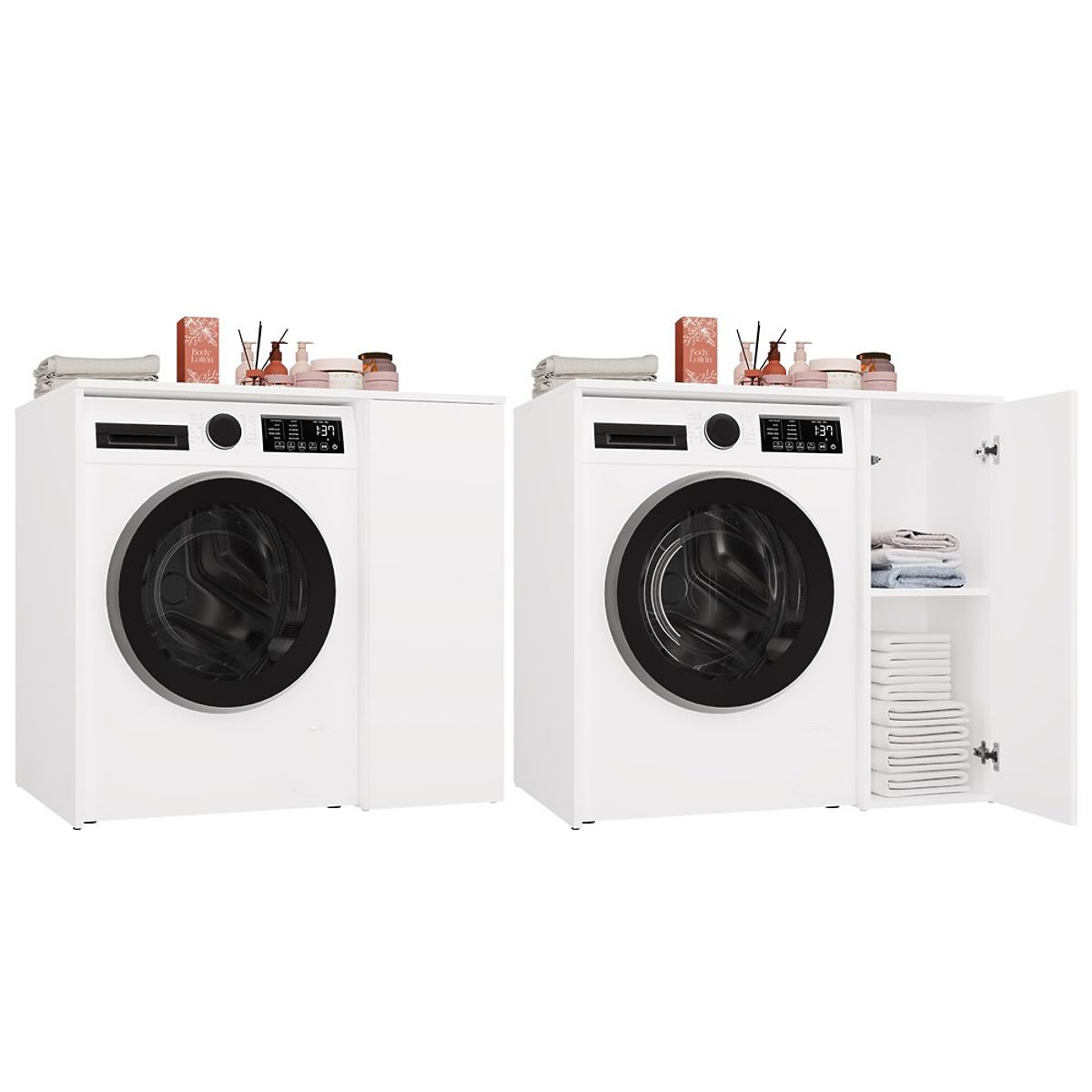 Fehér mosógép szekrény két polccal és ajtóval. .. többet