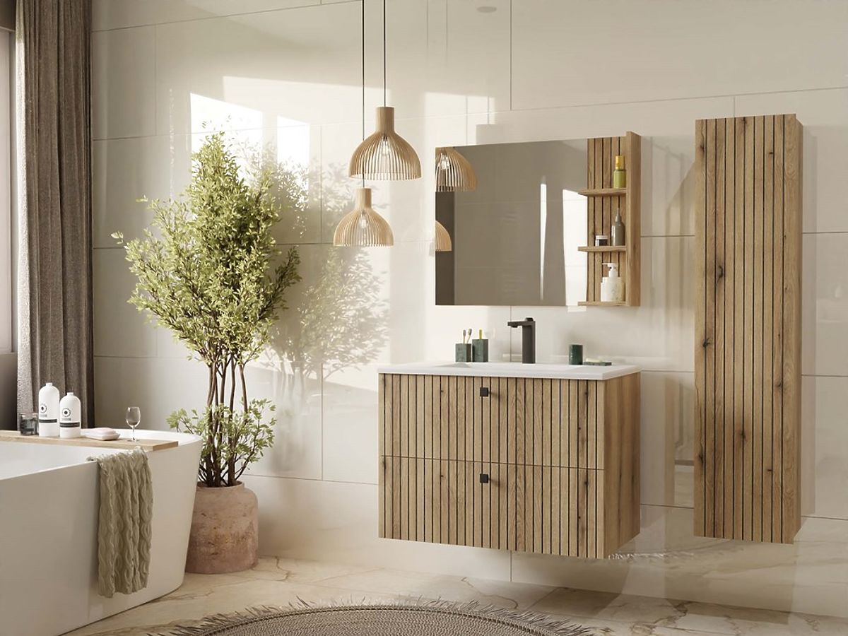 Lukafurniture.hu » Fürdőszoba és WC / Fürdőszobák szekrények / FÜRDŐSZOBASZEKRÉNY MOSDÓ ALÁ TIGO 80 2S TÖLGY EVOKE 2 FIÓK ROVÁSMINTÁS ELŐLAP FÜGGESZTETT