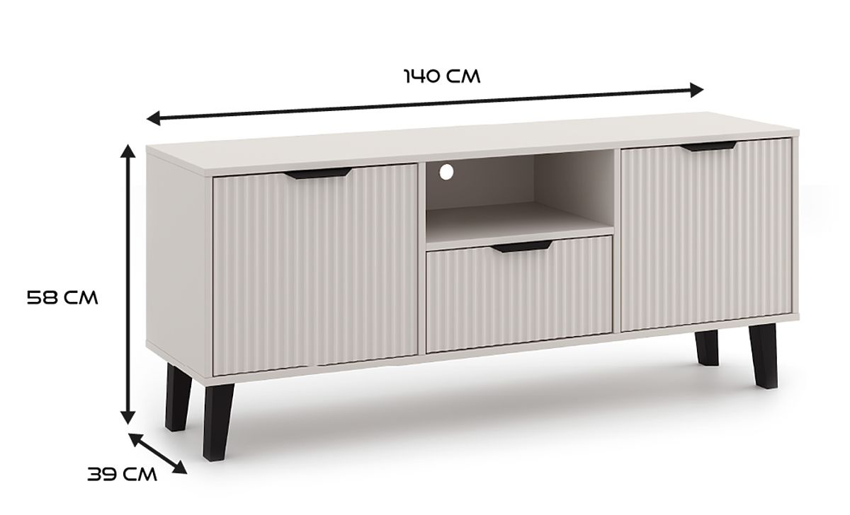 A bútor remekül illik a nappaliba, mint az otthoni szórakozás központja – elfér rajta a televízió, konzol, dekóder vagy multimédiás kiegészítők. A hátsó falon található praktikus nyílás megkönnyíti a kábelek vezetését, a tágas belső tér – beleértve két szekrényt és egy fiókot – pedig elnyeli a szükséges tárgyakat, megőrizve a rendet és az esztétikát.