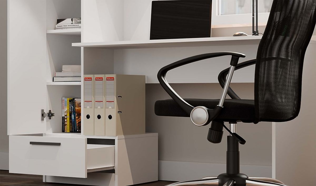 Az integrált polc ajtóval zárható részt tartalmaz, amely mögött három tágas polc található, valamint egy fiókot és nyitott polcokat, így könnyedén rendszerezheti az összes szükséges dolgot – a könyvektől és dokumentumoktól kezdve az apróságokig.