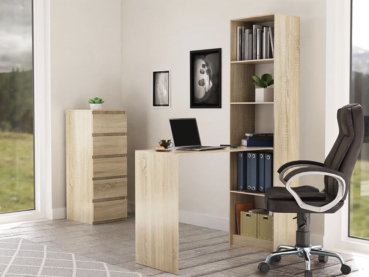 Ez a készlet kiválóan alkalmas otthoni szobákba és irodákba egyaránt. Az íróasztal jobb vagy bal oldalra is szerelhető. A polc és az íróasztal kombinációjának kiválasztásával 4 polcot kap dokumentumok, könyvek vagy más apró tárgyak számára, valamint kényelmes munkaterületet.