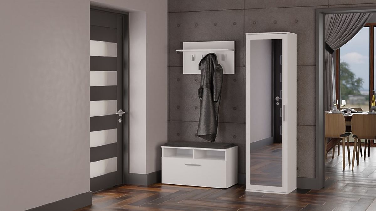 Tükrös, fehér szekrény modern dizájnnal és praktikus tárolási lehetőségekkel. .. többet