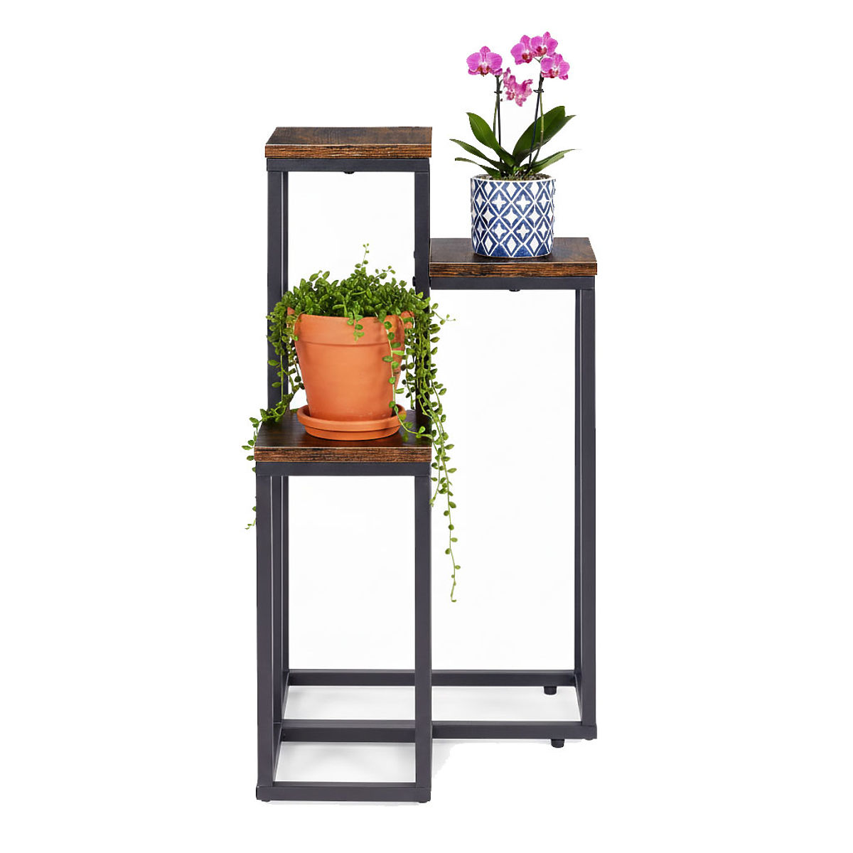 TARTÓS ANYAGOKA virágállvány porfestett acélból készült, amely korrózióállóságot és mechanikai sérülésekkel szembeni védelmet biztosít. A forgácslapból készült polcok természetes fa hatású színben készültek, ami kiemeli a bútor dekoratív, loft jellegét.