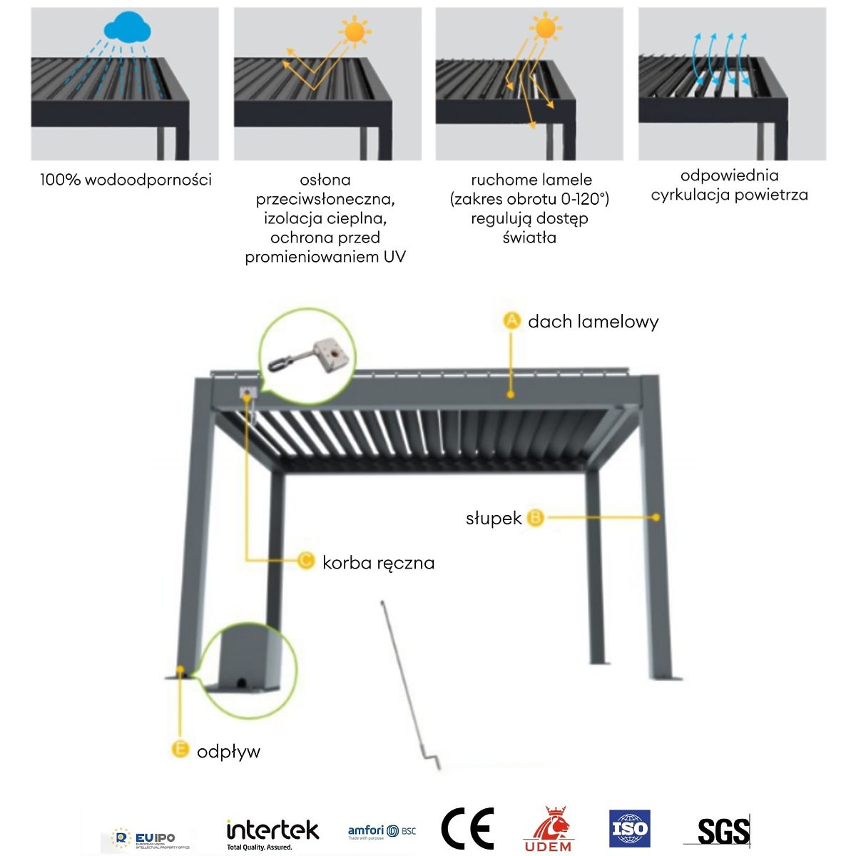 - Masszív, korrózióálló alumínium szerkezet, amely ellenáll a 120 km/h sebességű szélnek és a 60 kg/m² hóterhelésnek