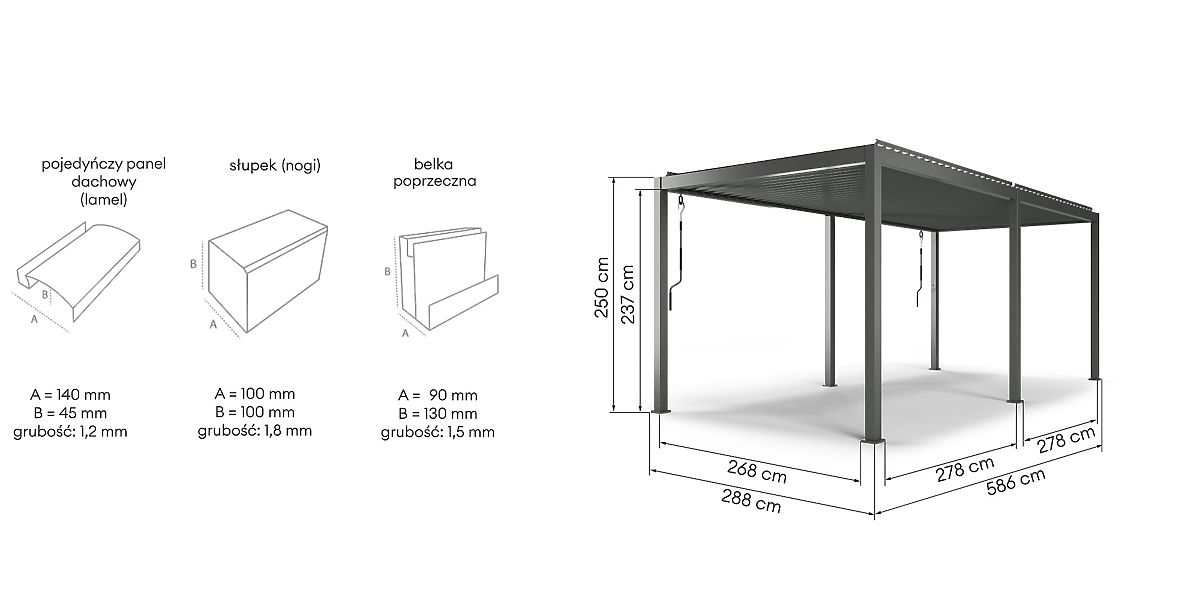 Fedezze fel a pihenés és a friss levegőn való időtöltés korlátlan lehetőségeit az Antilla kerti pergolával! Ez a szabadon álló, masszív alumíniumból készült szerkezet nemcsak eleganciát és funkcionalitást kölcsönöz kertjének, hanem teret is biztosít a pihenéshez és az emlékezetes pillanatok megéléséhez szeretteivel. Impozáns mérete - 6x3 m - sokkal nagyobb funkcionalitást és rugalmasságot kínál a kisebb modellekhez képest. A nagy tér lehetővé teszi a különböző részekre való felosztást, például étkező- és pihenőrészre, valamint kényelmes relaxációs zóna kialakítását, amelyet innovatív megoldások, mint például audiorendszerek vagy vetítővásznak gazdagítanak filmnézéshez. A nagyobb méreteknek köszönhetően a pergola a kert vagy terasz központjává válik, kényelmesen elférnek alatta pihenőgarnitúrák és kerti bútorok. Az ilyen megoldás nagyobb kényelmet nyújt társasági összejöveteleknél, és jobb elválasztást biztosít a környezettől, növelve a magánszféra érzését. Ezenkívül a 3x6 m-es pergola könnyedén befogad két közepes méretű autót, biztosítva azok fedett tárolását, védelmet nyújtva az eső, hó és káros UV-sugárzás ellen. Az erő és elegancia kéz a kézben jár - az Antilla pergola alumínium szerkezete nemcsak modern dizájnnal bűvöl el, hanem rendkívüli tartóssággal is. Ellenáll a korróziónak, és kibírja a 120 km/h sebességű szelet és a 60 kg/m² hóterhelést. Tetője mozgatható lamellákból áll, amelyek dőlésszöge az időjárási viszonyokhoz igazítható két kényelmes karral. A panelek nemcsak a fény bejutását szabályozzák, hanem 100%-os vízállóságot is garantálnak zárás után, hatékonyan védve az esőtől és a túlzott napsugárzástól. Pergoláink lamellái 100%-ban alumíniumból készülnek - könnyűek, korrózióállóak és rendkívül tartósak. Az acél megoldásokkal ellentétben nem rozsdásodnak és nem terhelik a szerkezetet. Emellett ideális légáramlást biztosítanak, kényelmes légkört teremtve használat közben. A pergola átgondolt szerkezete lehetővé teszi a csapadékvíz hatékony elvezetését, és a rendszer minden eleme diszkréten rejtve van a négy láb mindegyikében, így az egész esztétikus megjelenést őriz meg. Az Antilla bioklimatikus pergola rendelkezik a szükséges tanúsítványokkal és igazolásokkal, amelyek igazolják a legmagasabb szabványok teljesítését, így tökéletesen illeszkedik mind magánteraszokhoz és kertekhez, mind kereskedelmi helyiségekhez, mint például éttermi és szállodai kertek. A pergola önálló összeszerelésre készült - a készletben mindent megtalál, ami szükséges saját pihenőoázisának kialakításához, és a lépésről lépésre útmutató egyszerűvé és kielégítővé teszi az összeszerelési folyamatot. Hogy pihenése még kellemesebb legyen, pergoláját további fizetős kiegészítőkkel is felszerelheti. A könnyen tisztítható fehér színű szövetfüggöny nemcsak további védelmet nyújt a nap ellen, hanem átlátszóságával a könnyedség és szabadság légkörét teremti meg. Ha pedig átfogó védelemre vágyik, válassza a screen típusú rolót. Az időjárásálló szövetből készült, védelmet nyújt az UV-sugárzás, enyhe szél és eső, valamint rovarok ellen, miközben kellemes árnyékolást biztosít. Eldöntheti, hogy a pergola hány falára és hogyan szeretne függönyöket vagy rolókat felszerelni. Ehhez a konfigurátorban ki kell választani a mennyiséget és a fal szélességéhez igazított méretet. A pergola hosszabbik oldalát egy további láb támasztja alá, ezért a 586 cm-es falhoz két roló és függöny készlet szükséges, mindegyik 278 cm széles. De ez még nem minden! Hogy belemerüljön az esti varázslatos hangulatba, válasszon hangulatvilágítást LED-del. Választhat a hagyományos, távirányítóval és vezérlődobozzal ellátott vagy az energiatakarékos napelemes világítás között, amely napelem és beépített akkumulátor segítségével működik.