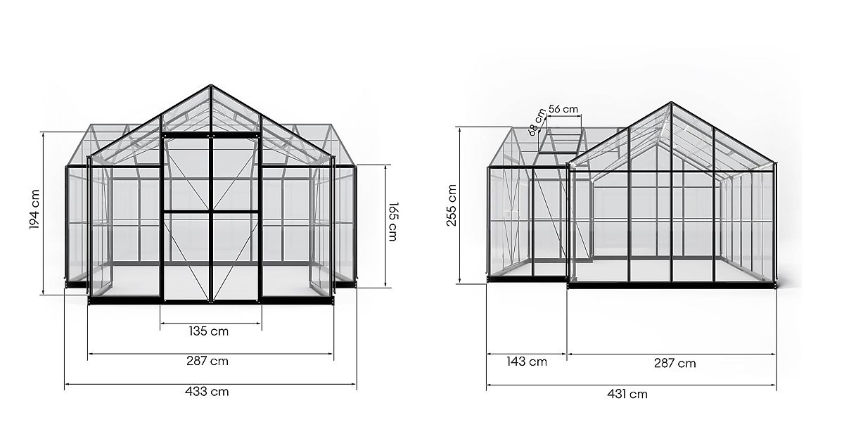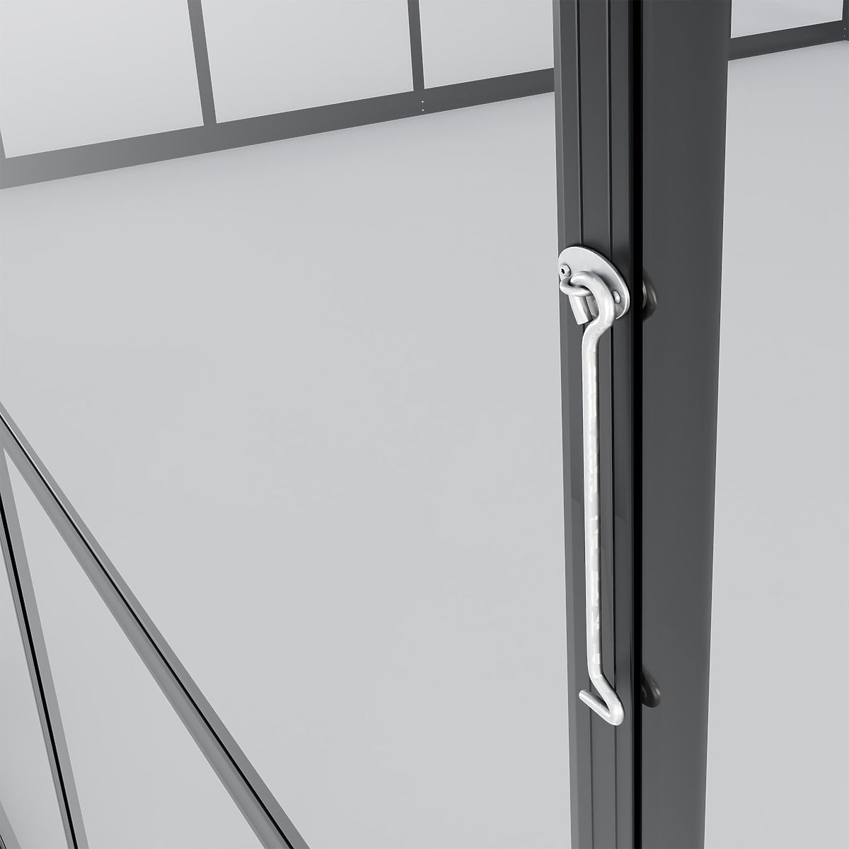 Az üvegház erős, 1-2 mm vastag alumínium szerkezettel rendelkezik, amelyet rozsdamentes acél csavarokkal erősítettek meg. További vízszintes merevítők találhatók minden falon és a tetőn, amelyek maximális stabilitást biztosítanak. A Royal Green Standard kiváló feltételeket biztosít a növények termesztéséhez a négy billenő tetőablaknak köszönhetően, amelyek megfelelő szellőzést és hőmérséklet-szabályozást biztosítanak belül. A kétszárnyú tolóajtók szabad bejárást tesznek lehetővé, és az integrált ereszcsatorna rendszer hat lefolyóval hatékonyan vezeti el az esővizet, ami támogatja a környezetbarát növénytermesztést.