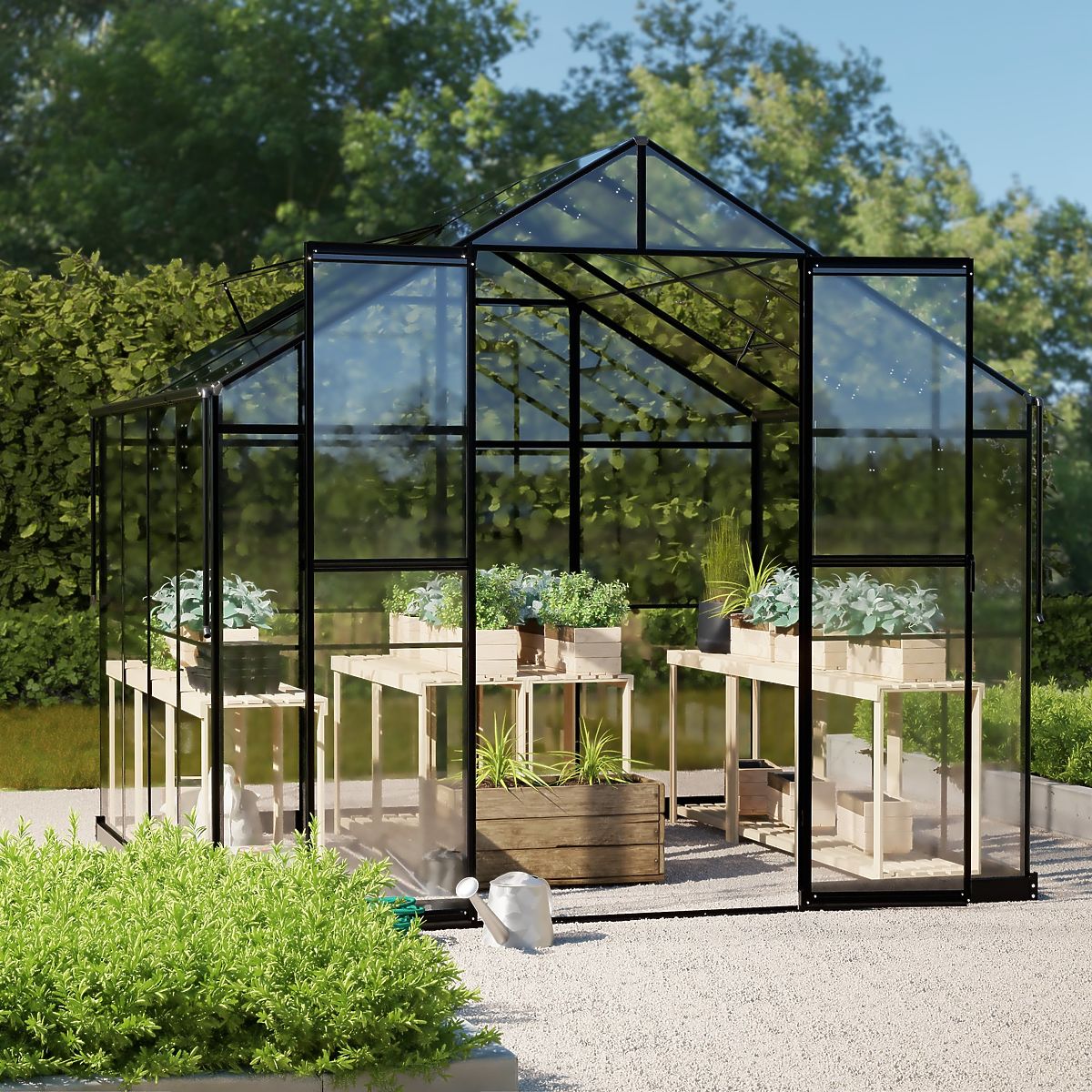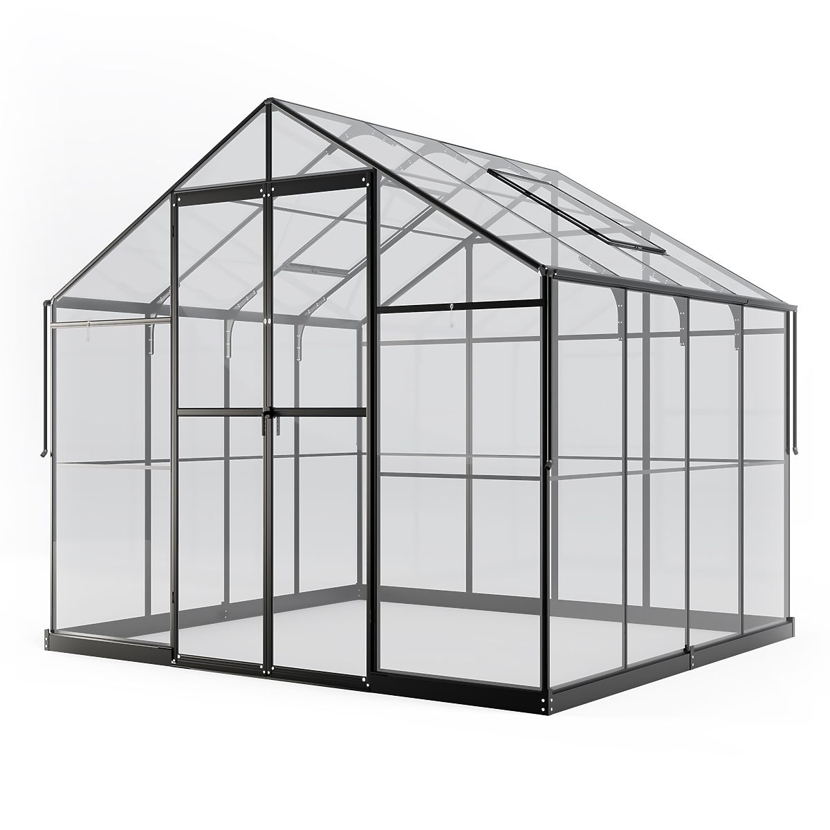 Az üvegház szilárd, 1-1,8 mm vastag alumínium szerkezettel rendelkezik, amelyet rozsdamentes csavarok erősítenek meg. A további stabilitást egy 12 cm magas fém alap biztosítja. Két billenő ablak és egy zárható kétszárnyú ajtó megfelelő szellőzést biztosít, ami kulcsfontosságú a növények egészséges növekedéséhez és a kényelmes tartózkodáshoz az üvegházban. Az alacsony küszöb a bejáratnál megkönnyíti a belépést és a berendezések, például fűnyíró vagy talicska bevitelét.