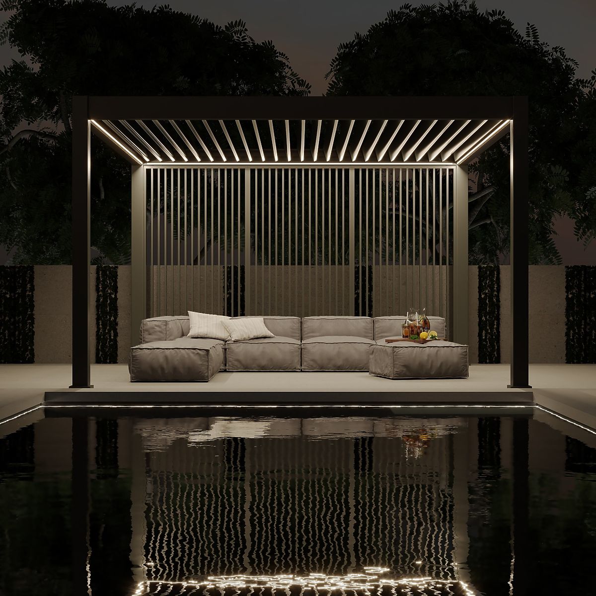 Önállóan álló Lumera kerti pergola alumíniumból, 4x4 m, bioklimatikus, LED világítás, elektromos