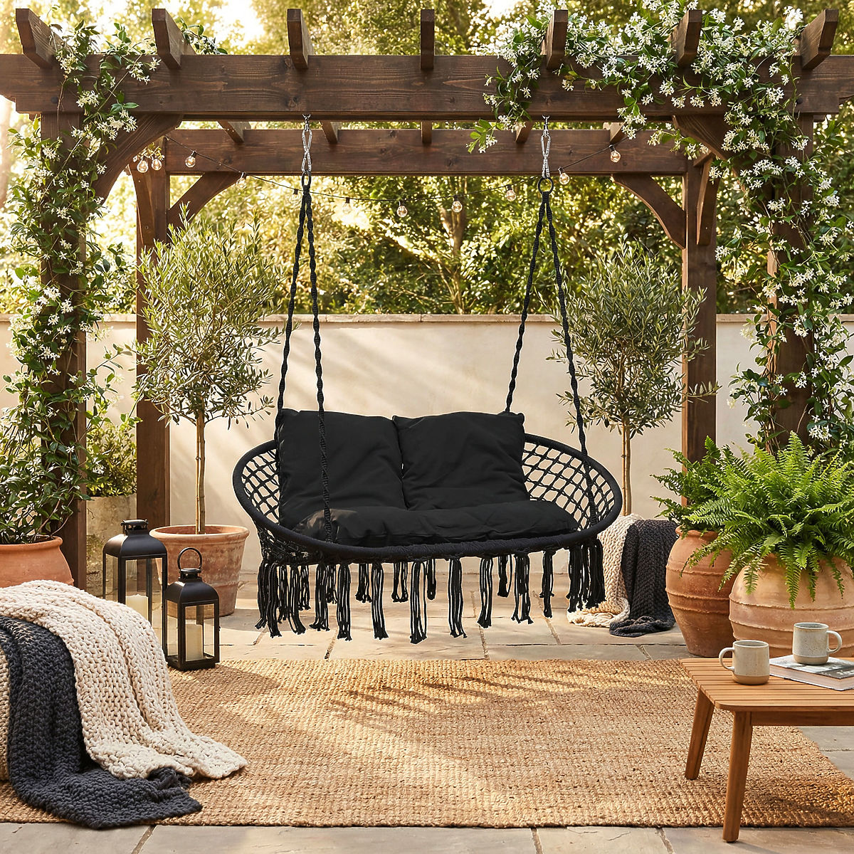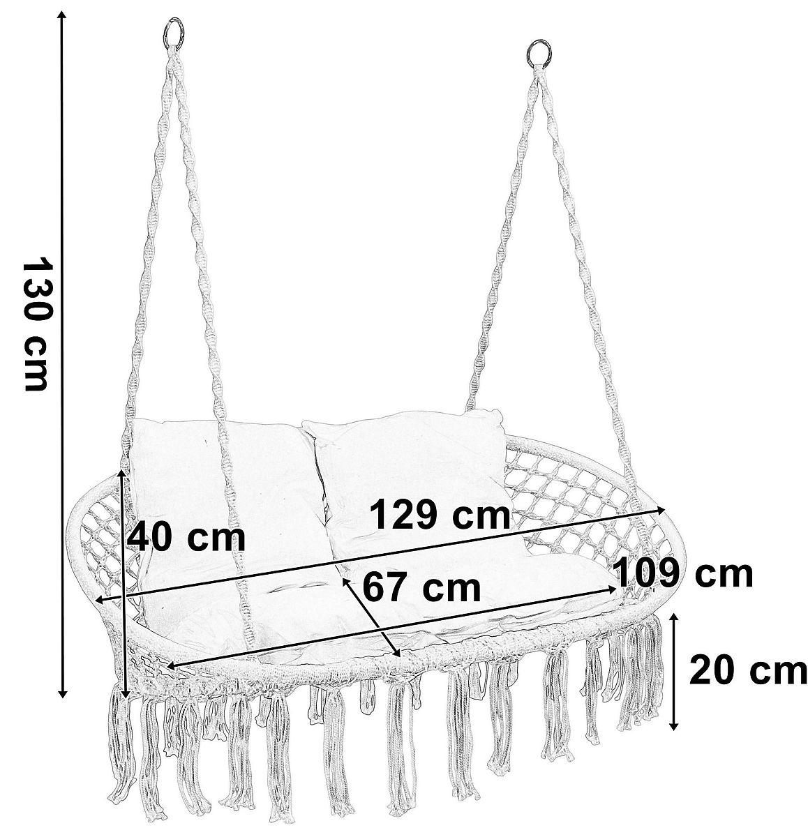 A Lagos kerti hinta a legújabb trend a belsőépítészetben. Kiválóan alkalmas két személy pihenésére, teherbírása akár 300 kg. Az acélkeret gyönyörű, boho stílusú fonott mintákkal van borítva. A kényelmes ülést tartó kötelek fémgyűrűkkel végződnek, ami jelentősen megkönnyíti az egy- vagy kétpontos hintafelszerelést. A készlethez tartozó puha párnák szemet gyönyörködtető kompozíciót alkotnak, és jelentősen növelik a használat kényelmét.