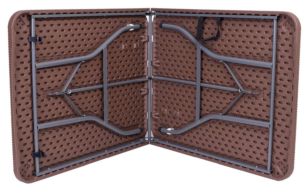 Összecsukható catering asztal. Nagyon praktikus és könnyű. Porszórt acél szerkezet. HDPE polietilén asztallap. Rattan mintázatú. Napfényálló. Egyedi kialakításának köszönhetően az egész szerkezet az asztallapba rejthető, kevés helyet foglal, és ergonomikus, könnyen hordozható bőröndöt képez.