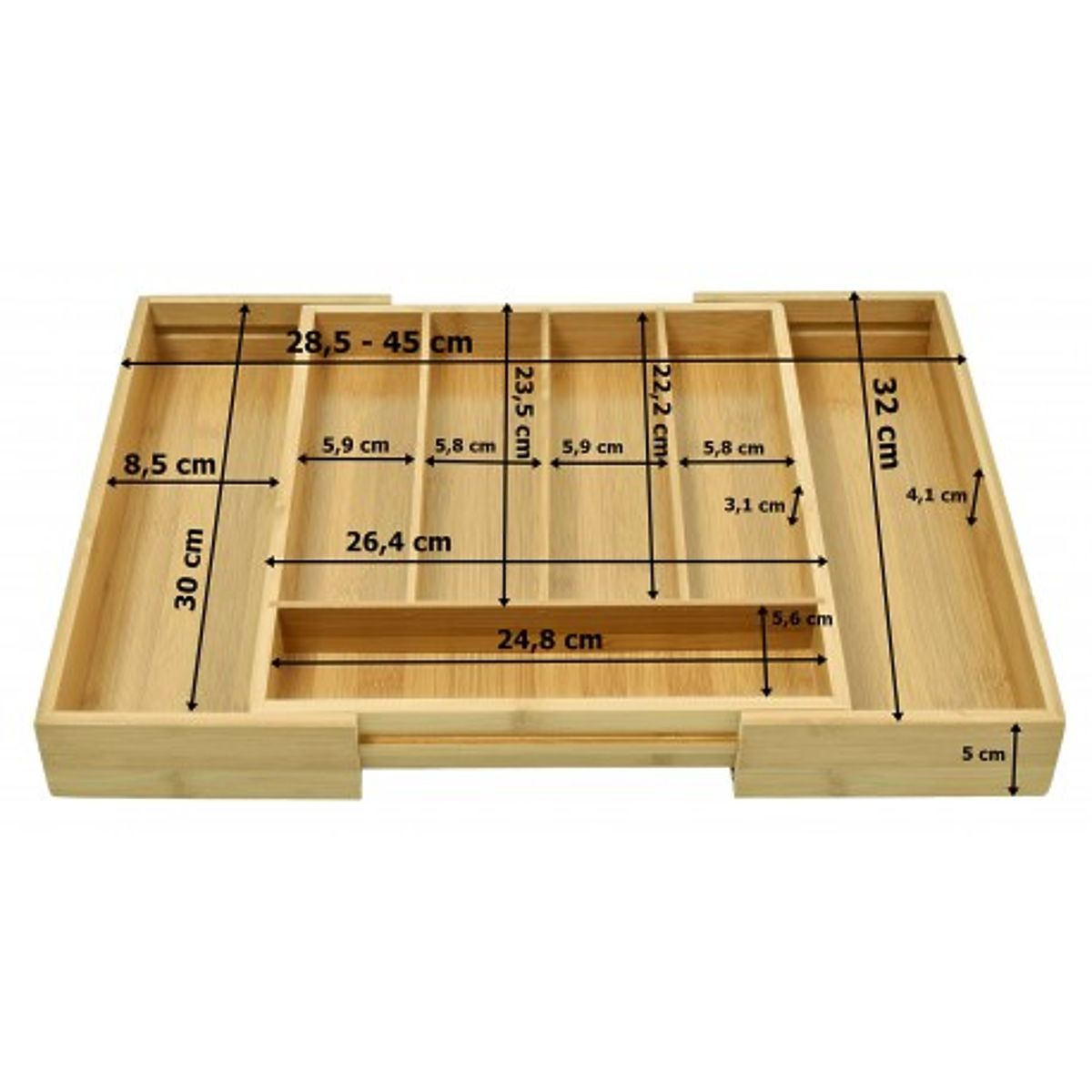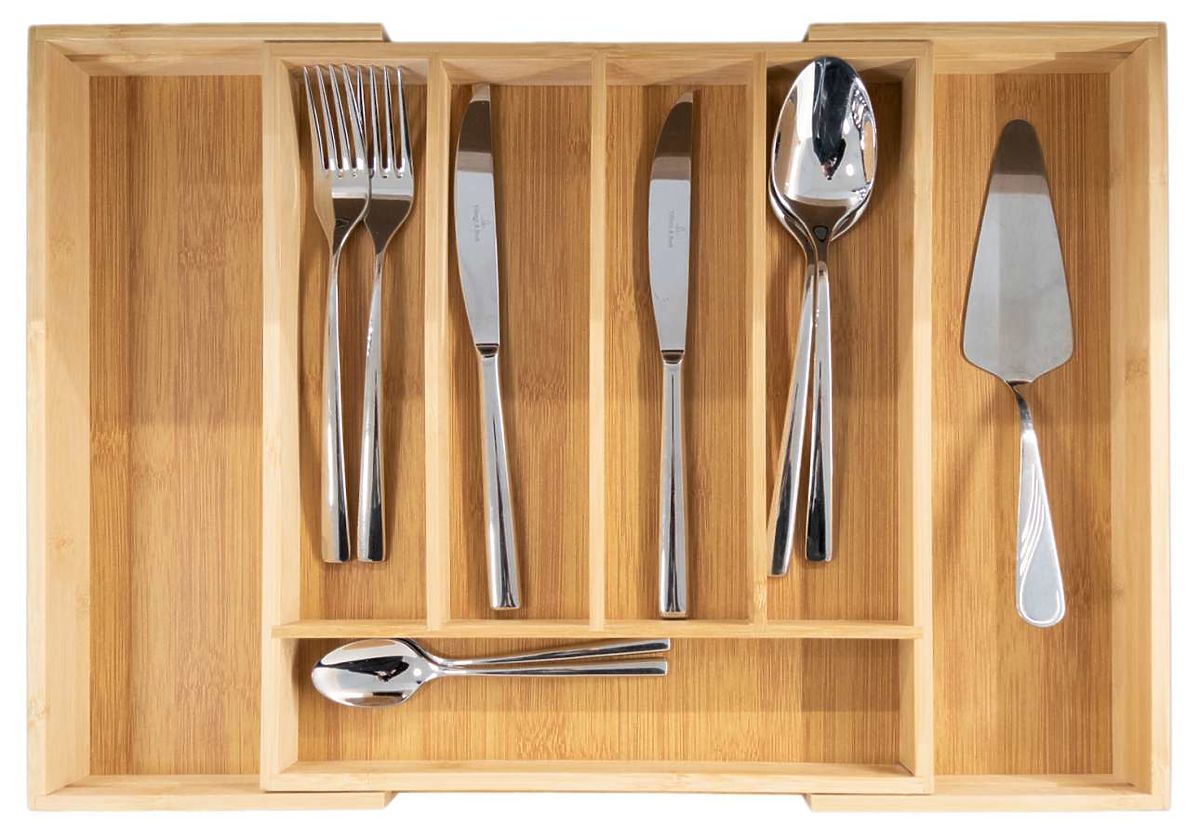 Praktikus evőeszköz rendező, amely természetes bambuszból készült. A bambusz rendező nagyon tágas. Akár 7 praktikus rekesszel rendelkezik, öt az evőeszközöknek és kettő a késeknek és nagyobb konyhai eszközöknek. A bambusz rendező kihúzható, az oldalsó rekeszek szükség esetén behúzhatók, így értékes helyet takarít meg. Segítségével rend és tisztaság uralkodik a konyhai fiókokban. Kompakt méretei biztosítják, hogy a legtöbb szabványos fiókba beleférjen.