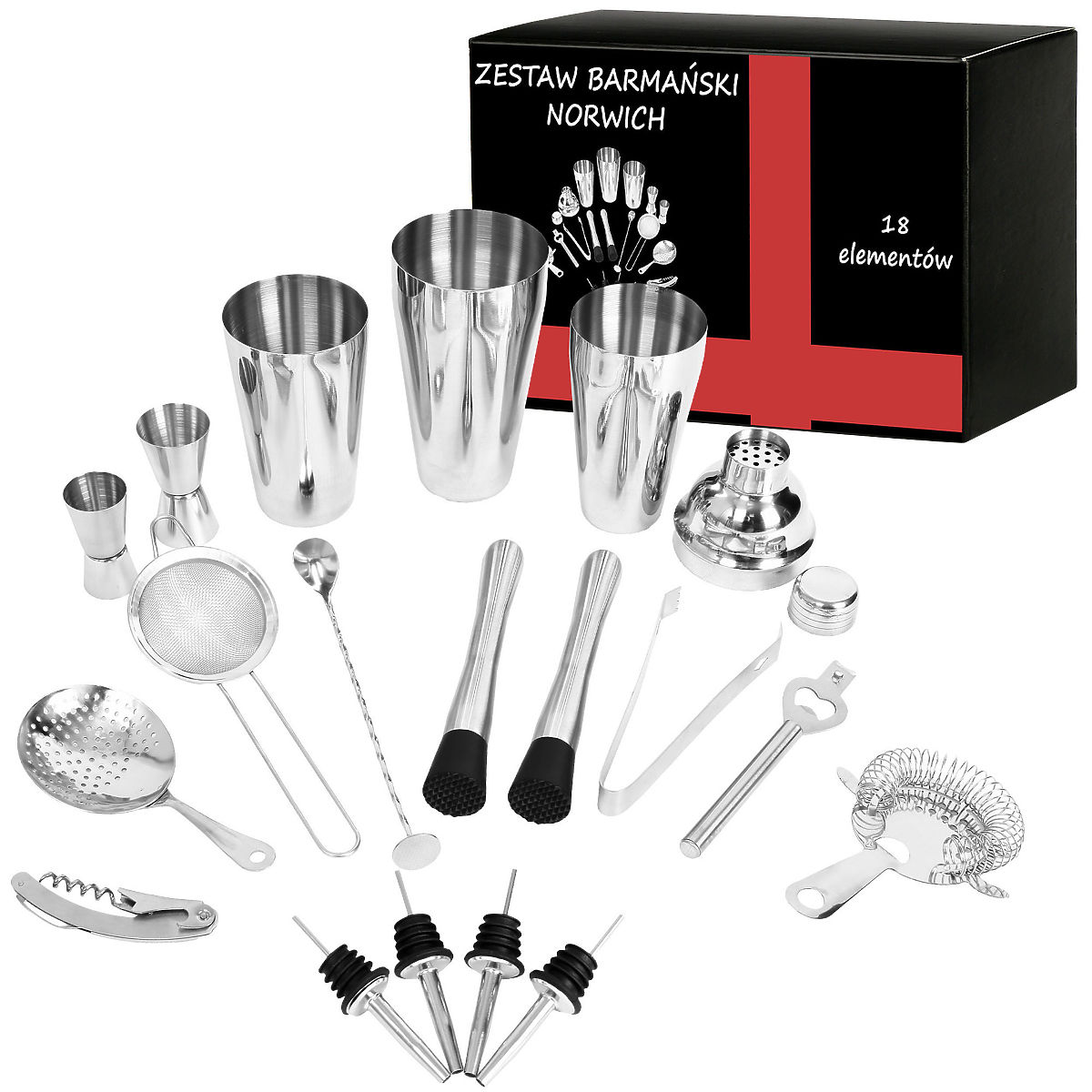 Kiváló minőségű bármixer készlet rozsdamentes acélból. Tartalmaz mindent, amire szükség van - boston shaker, cobbler, mérőpoharak, kiöntő és mások. Részletes lista alább. Az egész készlet nemesacélból készült, így az italok megőrzik egyedi ízüket. A készlet kényelmesen mosható mosogatógépben. Ajándéknak ajánljuk.